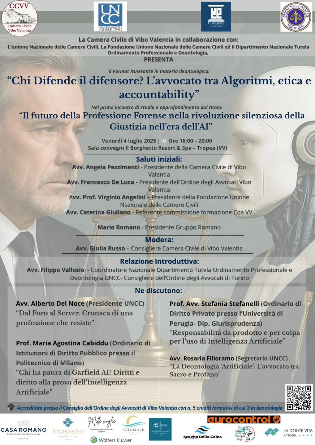 Al convegno prenderanno parte gli avvocati Angela Pezzimenti, presidente della Camera civile di Vibo Valentia; Francesco De Luca, presidente dell’Ordine degli avvocati di Vibo Valentia; Virginio Angelini, presidente della Fondazione Unione nazionale delle Camere civili; Caterina Giuliano, referente Commissione formazione Coa Vv; Mario Romano, presidente Gruppo Romano. Modera l’incontro l’avvocato Giulia Russo, consigliere Camera Civile di Vibo Valentia. La relazione introduttiva sarà affidata a Filippo Vallosio, coordinatore nazionale dipartimento Tutela ordinamento professionale e deontologia UNCC e consigliere dell’Ordine degli avvocati di Torino. Prenderanno parte inoltre al dibattito gli avvocati Alberto Del Noce, presidente UNCC, che tratterà il tema “Dal Foro al server. Cronaca di una professione che resiste”; Stefania Stefanelli, ordinario di Diritto privato all’Università di Perugia, che interverrà su “Responsabilità da prodotto e per colpa per l’uso di intelligenza artificiale”; Rosaria Filloramo, segretario UNCC, che discuterà su “La deontologia artificiale: l’avvocato tra sacro e profano” e la professoressa Maria Agostina Cabiddu, ordinario di Istituzioni di diritto pubblico al Politecnico di Milano, che tratterà il tema “Chi ha paura di garfield AI? Diritti e diritto alla prova dell’intelligenza artificiale”.