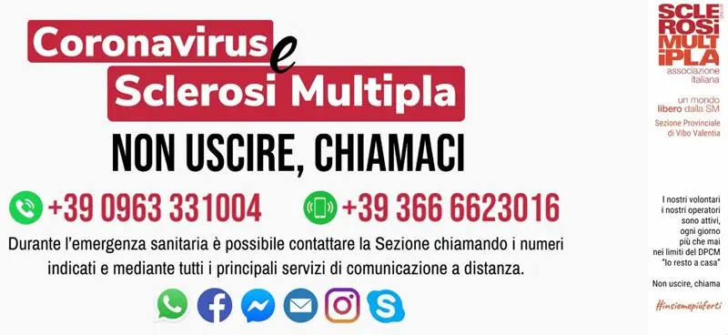 Non si ferma l’azione della sezione provinciale Aism con sede a Ionadi. Anzi, in questo momento di emergenza Covid-19 sta operando con ancora più forza per garantire supporto diretto a tutte le persone alle prese con la sclerosi multipla. Un’azione poliedrica, portata avanti attraverso i servizi di: call center, indicazioni su ritiro e consegna dei farmaci e spesa a domicilio, secondo le modalità adottate nei diversi comuni, e un diario attivo sulla pagina facebook per raccontarsi in questo momento di quarantena. In piena sintonia con l’Aism nazionale, la sezione vibonese sta, tra l’altro, portando avanti l’indagine necessaria a comprendere come il coronavirus stia condizionando la vita e le cure delle persone con sclerosi multipla.