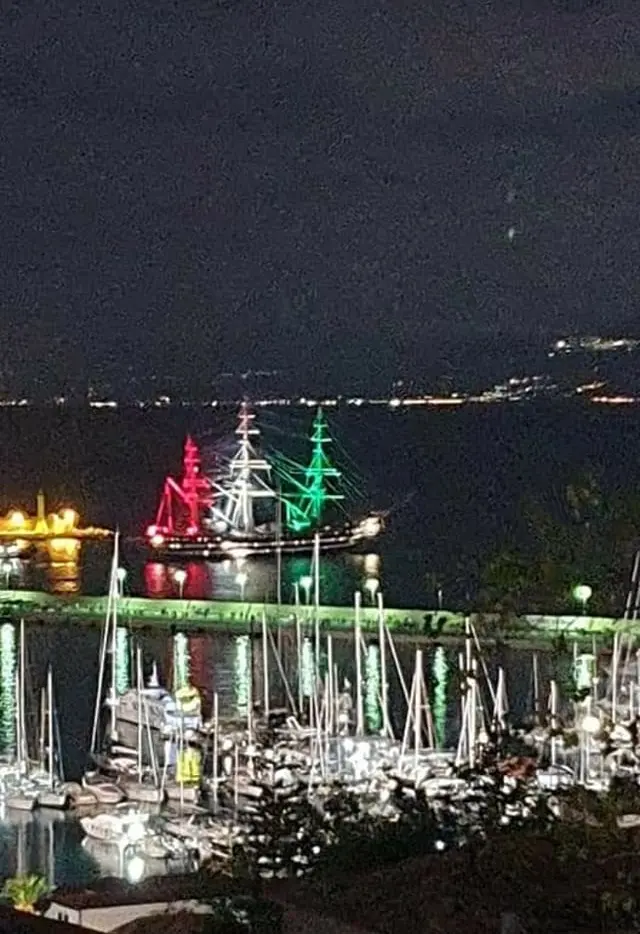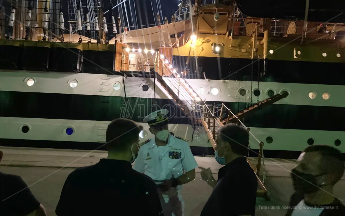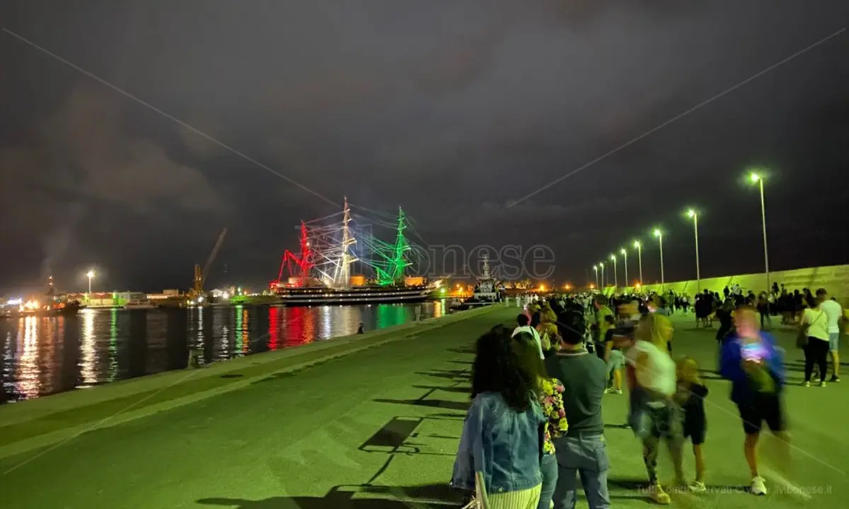 Giornata importante per il porto di Vibo Marina, che con l’arrivo della storica nave-scuola della Marina Militare “Amerigo Vespucci” ha fatto accendere i riflettori sullo scalo marittimo vibonese . La banchina “Cortese” si è riempita come non mai, durante le poche ore di sosta del maestoso veliero, di migliaia di cittadini di ogni età, famiglie intere giunte da ogni parte della Calabria per accogliere e godere dello spettacolo offerto dalla splendida e leggendaria nave illuminata con le luci del Tricolore, effetto che ha reso ancor più prestigioso lo scalo di Vibo Marina. All’ingresso del veliero in porto vi era stata una singolare accoglienza da parte dell’omonimo istituto scolastico statale “A.Vespucci” di Vibo Marina i cui allievi, con la barca a vela in dotazione alla scuola, sono andati incontro al maestoso veliero con musicisti sul ponte che hanno suonato brani del concerto svoltosi nel mare del porto nel mese di agosto. [Continua in basso]