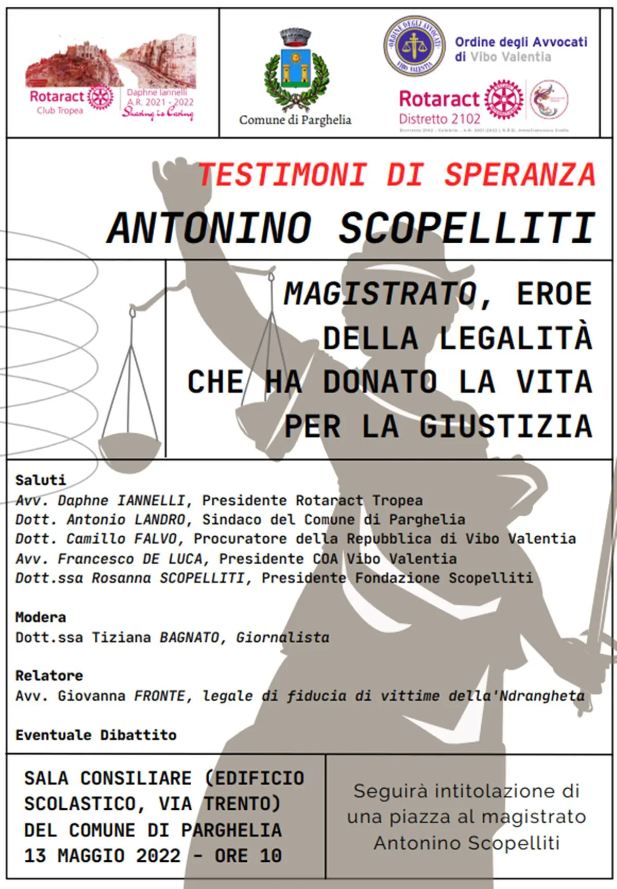 La seconda fase del progetto vedrà l’intitolazione a Parghelia di una piazza al magistrato Antonino Scopelliti, magistrato apprezzato per le qualità umane, professionali e l’impegno civile, ucciso in un agguato il 9 agosto 1991. L’evento si terrà nella sala consiliare all’interno dell’istituto scolastico di Parghelia e vedrà anche la partecipazione di alcune classi delle scuole secondarie di primo e secondo grado di Tropea.