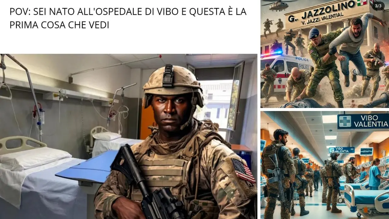 C’è poi Welcome to favelas Vibo che ha pubblicato una serie di immagini, probabilmente realizzate con l’Intelligenza artificiale, che mostrano uno Jazzolino super moderno e invaso dai militari. In corsia, ben armati, e fuori con scene persino di guerriglia e un elicottero militare a sorvegliare il tutto. Al limite dell’apocalittico, si direbbe. Una Vibo “violenta” insomma, come devono averla immaginata quanti, con vite e occhi lontani da qui, hanno visto al tg o letto sui giornali nazionali di una città che ha necessità di difendere i propri operatori sanitari con l’impiego dell’Esercito.