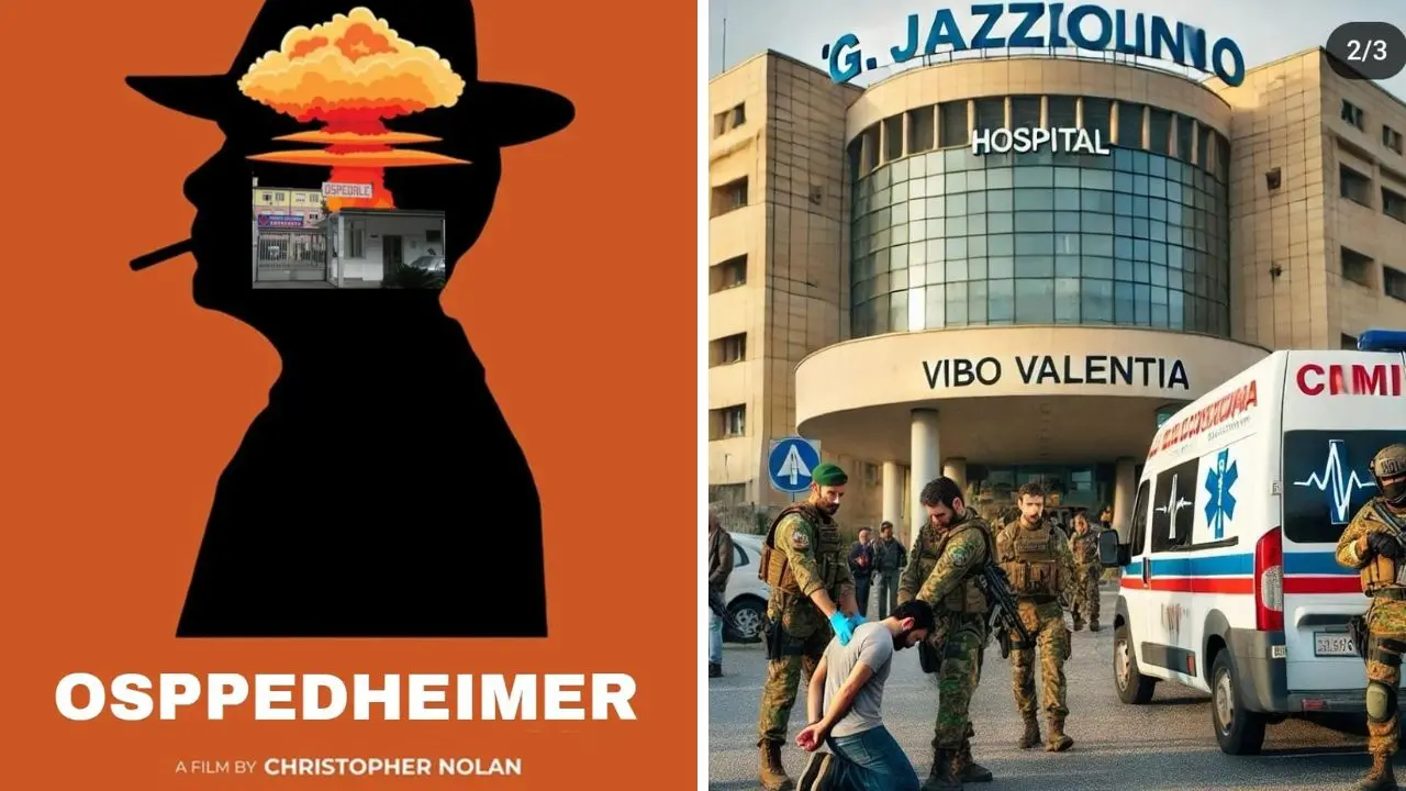 “Sei nato all’ospedale di Vibo e questa è la prima cosa che vedi”: in foto una stanza d’ospedale con due letti… e un militare bardato di tutto punto a vigilare. È solo uno dei meme che circolano negli ultimi giorni, a far ridere e a rendere più leggere un argomento serio e che tanto sta facendo discutere. A pubblicarlo su Instagram, la pagina Vibrocenter che è artefice anche di alcune locandine di film ritoccate ad hoc e con protagonista l’ospedale vibonese “militarizzato”: tutti titoli di Christopher Nolan, da Il cavaliere oscuro a Oppenheimer (che diventa Osppenheimer) fino a Dunkirk che nell’immagine è appunto “Jazzolino”.