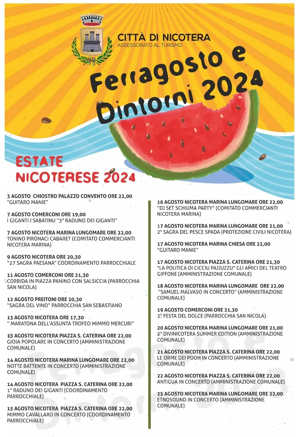 Il calendario degli eventi è stato stilato dall’amministrazione comunale e in particolare dall’assessorato al Turismo guidato da Antonio La Malfa. Hanno contribuito parrocchie, associazioni e alcuni commercianti. Nello specifico, si tratta di un gruppo di commercianti di Nicotera Marina che ha deciso di unirsi «per riportare la città ai fasti di un tempo». «L’obiettivo è chiaro – spiegano – far risplendere il nostro paese attraverso la collaborazione e l’entusiasmo di tutti. Il 7 agosto, la nostra estate si apre con il celebre comico calabrese Tonino Pironaci, accompagnato dai tradizionali panini con la salsiccia. Il 16 agosto, invece, sarà la volta di un Dj set esplosivo con Mr Hyde e Tigerman, insieme ai vocalist Diabolika e Miss Morena, direttamente da Canale 5, dove ha conquistato il pubblico con le sue partecipazioni a programmi di successo come “Il Muro” e “All Together Now”. La serata includerà anche uno schiuma party e spettacolari effetti speciali». Dai commercianti anche l’invito «a partecipare e a unirsi al nostro progetto. Solo con l’unione possiamo far risplendere Nicotera Marina». Di seguito il cartellone degli eventi completo.