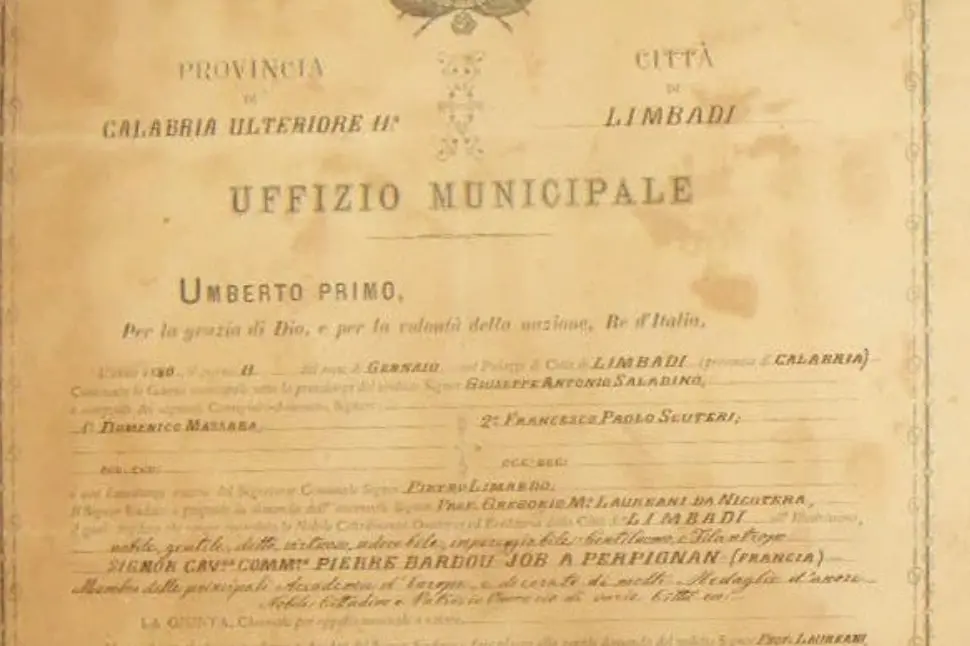 Vittorio Rossin, presidente dell’associazione culturale Ludovico di Breme, ha rinvenuto online un attestato di cittadinanza onoraria concesso dal Comune di Limbadi a Pierre Bardou-Job, industriale e collezionista d’arte francese, noto per essere tra i fondatori della celebre manifattura di cartine per sigarette JOB a Perpignano, in Francia.