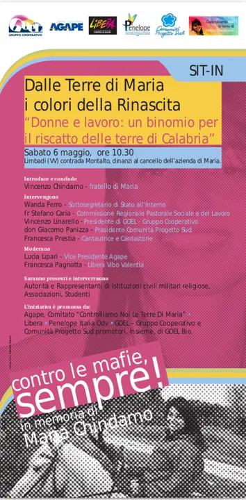 Sabato 6 maggio, alle ore 10.30, avrà luogo il sit-in in memoria di Maria Chindamo dal titolo “Dalle Terre di Maria i Colori della Rinascita”. Come ogni anno, proprio lo stesso giorno della scomparsa, si rinnova così un impegno e un appuntamento, davanti all’azienda dove Maria è scomparsa, in contrada Montalto a Limbadi. La manifestazione vedrà la partecipazione di scuole, associazioni, istituzioni e singoli cittadini che hanno scelto di condividere la richiesta di verità e di giustizia della famiglia. L’iniziativa è promossa da: Agape, Comitato “Controlliamo Noi Le Terre Di Maria”, Libera, Penelope Italia Odv, Goel – Gruppo Cooperativo e Comunità Progetto Sud promotori, insieme, di Goel Bio. [Continua in basso]