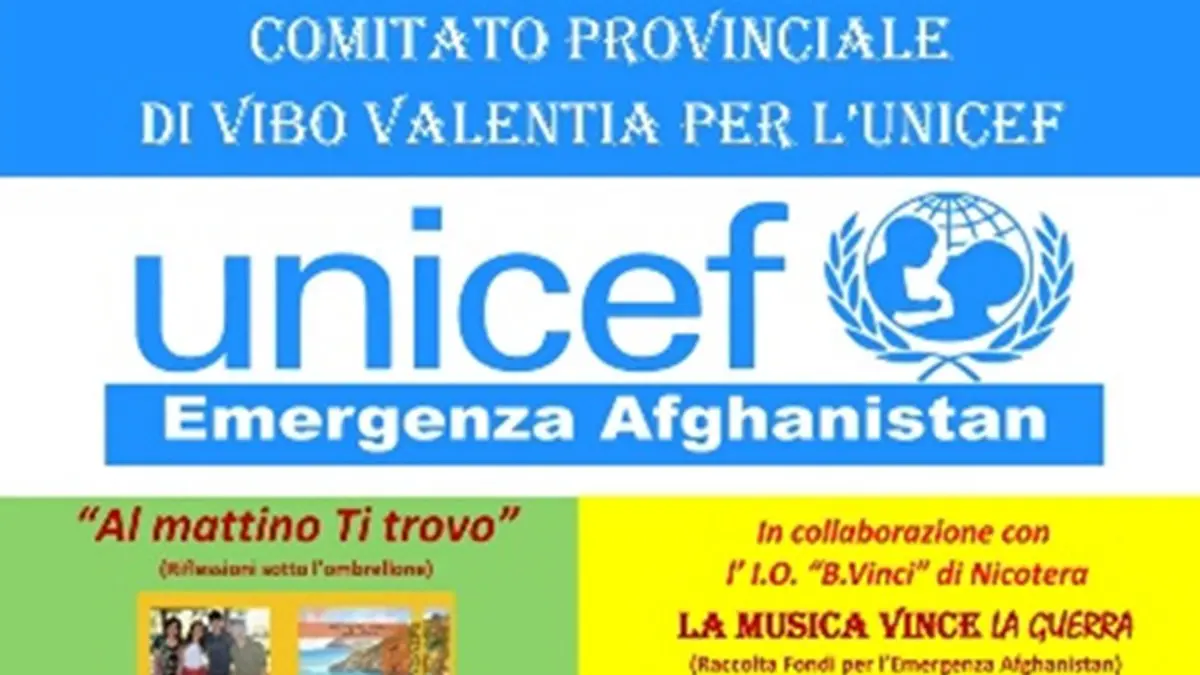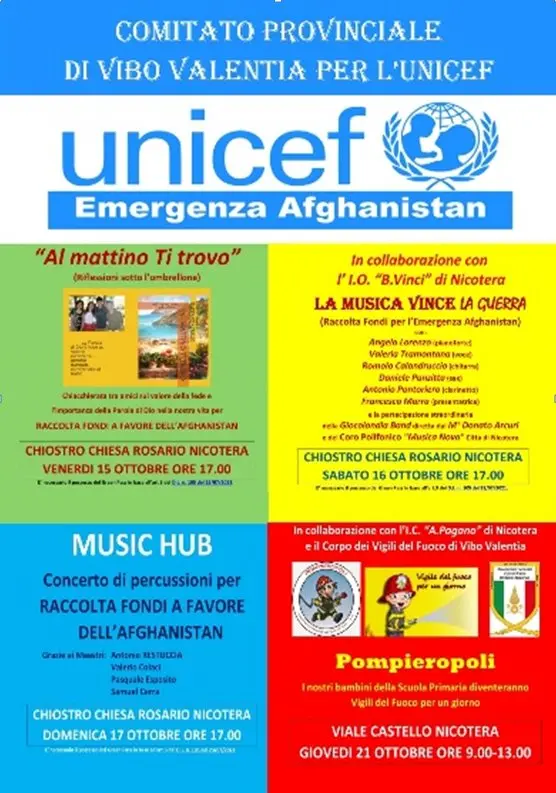 Il Comitato Provinciale di Vibo Valentia per l’Unicef presieduto da Gaetano Aurelio, raccogliendo l’invito dell’Unicef Italia di Raccolta Fondi per l’Emergenza Afghanistan, ha organizzato, grazie al contributo di alcune Scuole Amiche, di associazioni culturali, dei vigili del Fuoco e di tantissimi professionisti e persone generose i seguenti eventi: