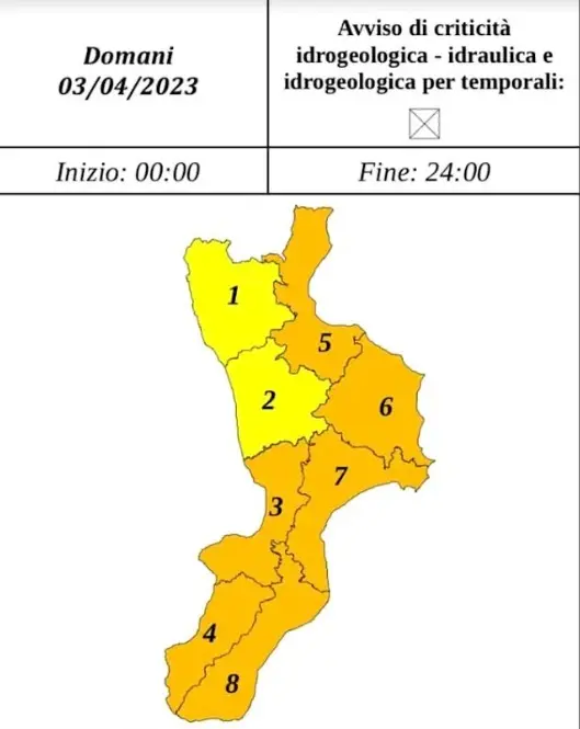 La protezione civile insieme al centro funzionale multirischi Arpacal ha emesso un’allerta arancione su tutto il versante jonico della Calabria e sul versante Tirrenico reggino, vibonese e catanzarese per la giornata di domani, lunedì 3 aprile. Il bollettino prevede fenomeni temporaleschi che potranno assumere carattere di nubifragio.