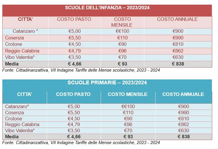 È di 93 euro la spesa media mensile che affronta una famiglia in Calabria per la mensa nell’anno scolastico in corso – in aumento di oltre il 26% – rispetto ai circa 85 euro (poco più di 4 euro a pasto) che rappresentano la media nazionale. La regione più costosa è la Basilicata (109 euro mensili) mentre quella più economica è la Sardegna (61 euro nell’infanzia e 65€ per la primaria). In Calabria, in particolare, si va dai 3,50 euro a pasto nelle scuole di Vibo Valentia ai 5,50 euro di Cosenza. È quanto emerge in occasione della VII indagine di Cittadinanzattiva sulle mense scolastiche.