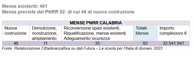 Secondo l’Anagrafe nazionale, un terzo degli edifici scolastici, ossia 13.533 su 40160, sono dotati di locale mensa. La distribuzione però non è omogenea, in quanto nelle Regioni del Sud poco più di un edificio su cinque dispone di una mensa scolastica (al Centro è il 41% e al Nord il 43%) e la quota scende al 15,6% in Campania e al 13,7% in Sicilia. La regione con un numero maggiore di scuole dotate di mensa è la Valle d’Aosta (72%), seguita da Piemonte, Toscana e Liguria dove è presente in 6 edifici su 10. In Puglia, Abruzzo e Lazio sono presenti in un edificio su quattro. Il Pnrr non viene incontro alle esigenze delle scuole del Sud, almeno non nella misura sperata. Su 1052 interventi previsti e 600 milioni di fondi stanziati, il Sud riceve – da graduatorie di giugno 2023, le ultime disponibili – la metà delle risorse, contro il 58% previsto dal piano originario.