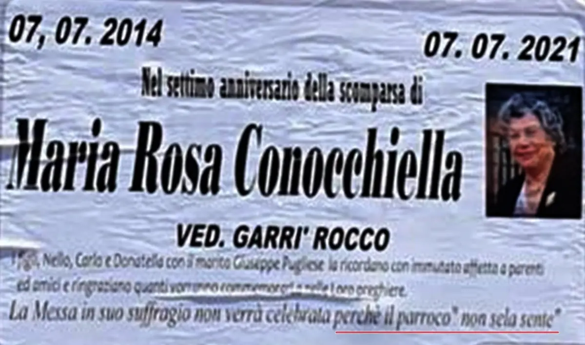 Si occuperà personalmente l’amministratore apostolico della diocesi di Mileto-Nicotera-Tropea monsignor Francesco Oliva – che è subentrato al dimissionario Luigi Renzo in attesa della nomina del nuovo vescovo – del presunto rifiuto di un parroco di Briatico a tenere una messa in suffragio della signora Maria Rosa Conocchiella nel settimo anniversario della scomparsa. Una vicenda finita su un manifesto fatto affiggere dai familiari della donna in diverse zone di Briatico e nelle frazioni, in cui è dato leggere testualmente che la messa in suffragio della donna “non verrà celebrata perché il parroco non se la sente”. I familiari della defunta – originaria di San Costantino di Briatico – sono stati ricevuti a Mileto da monsignor Francesco Oliva, che intende fare chiarezza sull’intera vicenda per riportare serenità in una comunità che da un paio di giorni si interroga sull’accaduto. Nelle prossime ore, il vescovo Oliva ascolterà anche la versione del parroco per cercare di fare piena luce su quanto successo.