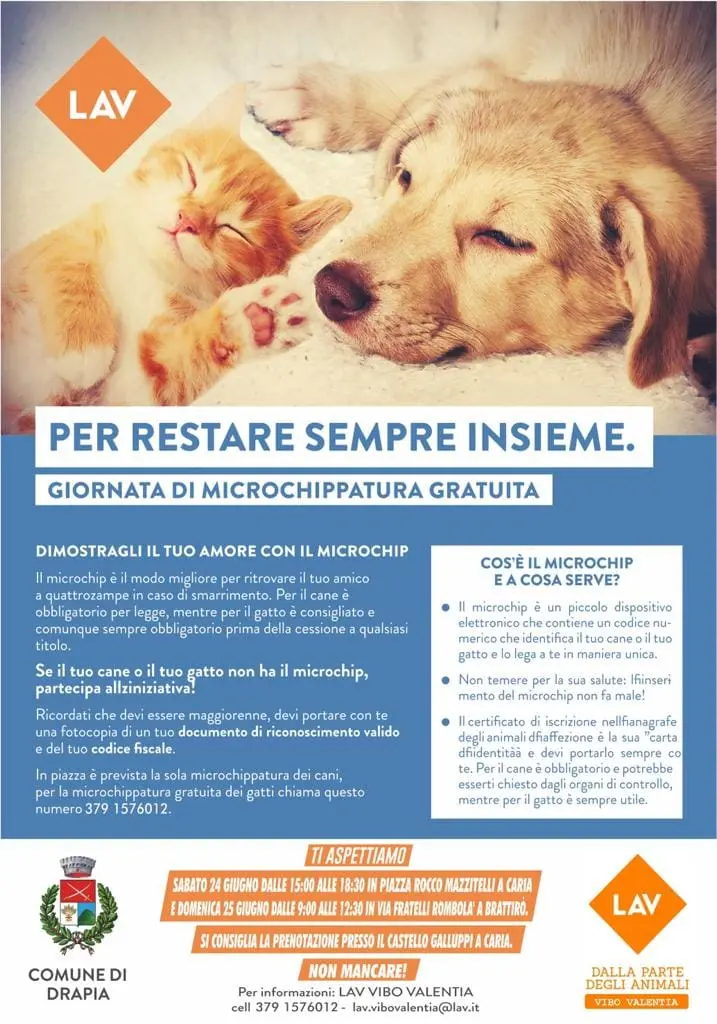 Dopo i positivi riscontri registrati nelle passate edizioni, la Lav, sezione Vibo Valentia torna a proporre in provincia due giornate dedicata alla microchippatura gratuita di cani e gatti. Gli appuntamenti saranno ospitati sabato 24 giugno, dalle ore 15.00 alle ore 18.00, in piazza Mazzitelli a Caria; domenica 25 giugno dalle ore 9.00 alle ore 12.30 in via Rombolà a Brattirò.