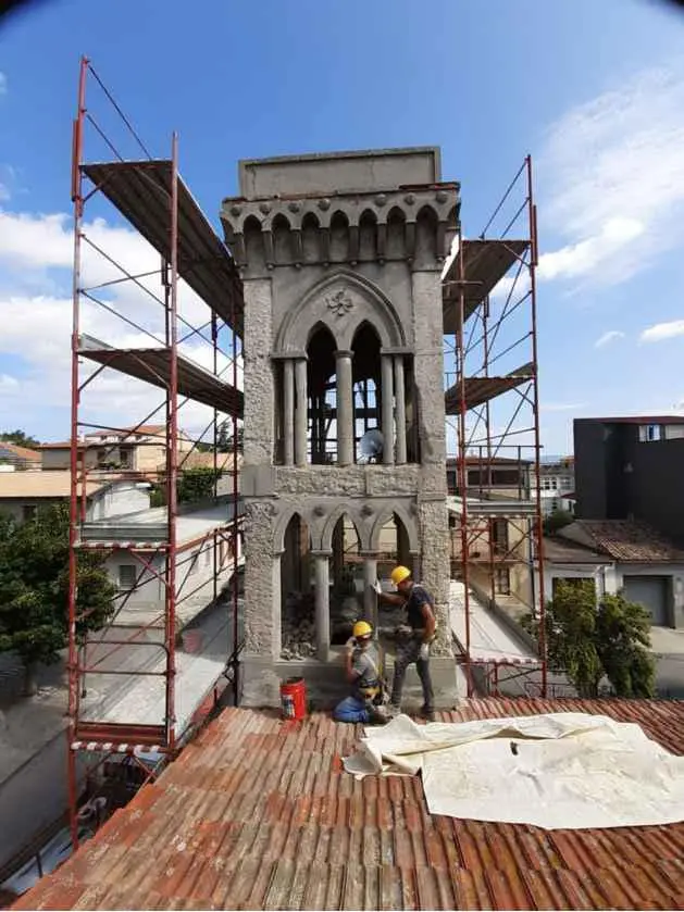 In questo contesto – si aggiunge – si è provveduto al trattamento di protezione dei ferri d’armatura, al rinforzo strutturale del calcestruzzo e delle pareti in mattoni esistenti ai primi due livelli, al restauro delle superfici, alla pavimentazione sul terrazzo e sulla superficie di ingresso, al restauro del solaio in legno, alla sostituzione del canale di gronda e converse, sul lato collegato all’edificio». L’inizio dell’edificazione nella nuova Mileto della chiesa intitolata a Maria Santissima della Cattolica risale al 1785 e si deve all’interessamento della famiglia Taccone Gallucci. Nel 1929 l’omonima Confraternita ha fatto costruire la torre campanaria esterna, oggetto del suddetto progetto di restauro teso al consolidamento strutturale e alla mitigazione degli effetti dell’azione sismica. L’edificio sacro, di medie dimensioni, si presenta al suo interno con tre navate, tripartite da setti di muro e il soffitto a cassettoni. La struttura architettonica, sia in pianta che in alzato, appare nella sua tipologia e nella sua forma equiparabile al romanico. La facciata esterna è molto semplice e priva di elementi decorativi. Tra l’altro, alla fine degli anni ’60 dello scorso secolo è stata interessata da un intervento che ha determinato la copertura delle pareti con intonaci a cemento, in cui le lesene sormontate dal cornicione venivano messe in evidenza insieme alle finestre lunettate. Oggi si presenta con una superficie muraria completamente in pietra a vista, a seguito del restauro eseguito alla fine del XX secolo. [GUARDA FOTO IN BASSO]