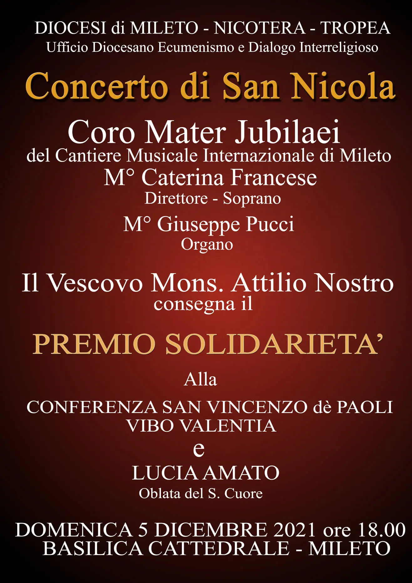 Va alla Conferenza “San Vincenzo de Paoli” di Vibo Valentia e alla suora “Oblata del Sacro Cuore” Lucia Amato, il Premio Solidarietà edizione 2021 proposto annualmente dall’Ufficio per l’ecumenismo e il dialogo interreligioso della diocesi di Mileto-Nicotera-Tropea. Il prestigioso riconoscimento sarà consegnato domenica 5 dicembre nel corso di un’apposita cerimonia che si terrà nella basilica cattedrale della cittadina normanna, chiesa madre della diocesi governata dall’ottobre scorso dal nuovo vescovo monsignor Attilio Nostro. Nell’occasione, a partire dalle ore 18, è previsto il concerto del Coro “Mater Jubilaei”, bella realtà del Cantiere musicale internazionale. Ad accompagnare all’imponente organo a canne, incastonato nella basilica cattedrale, il gruppo di cantori diretto dal soprano Caterina Francese, ci sarà il maestro Giuseppe Pucci. Il Premio Solidarietà sarà consegnato ai vincitori dallo stesso vescovo, monsignor Attilio Nostro, al termine del concerto.