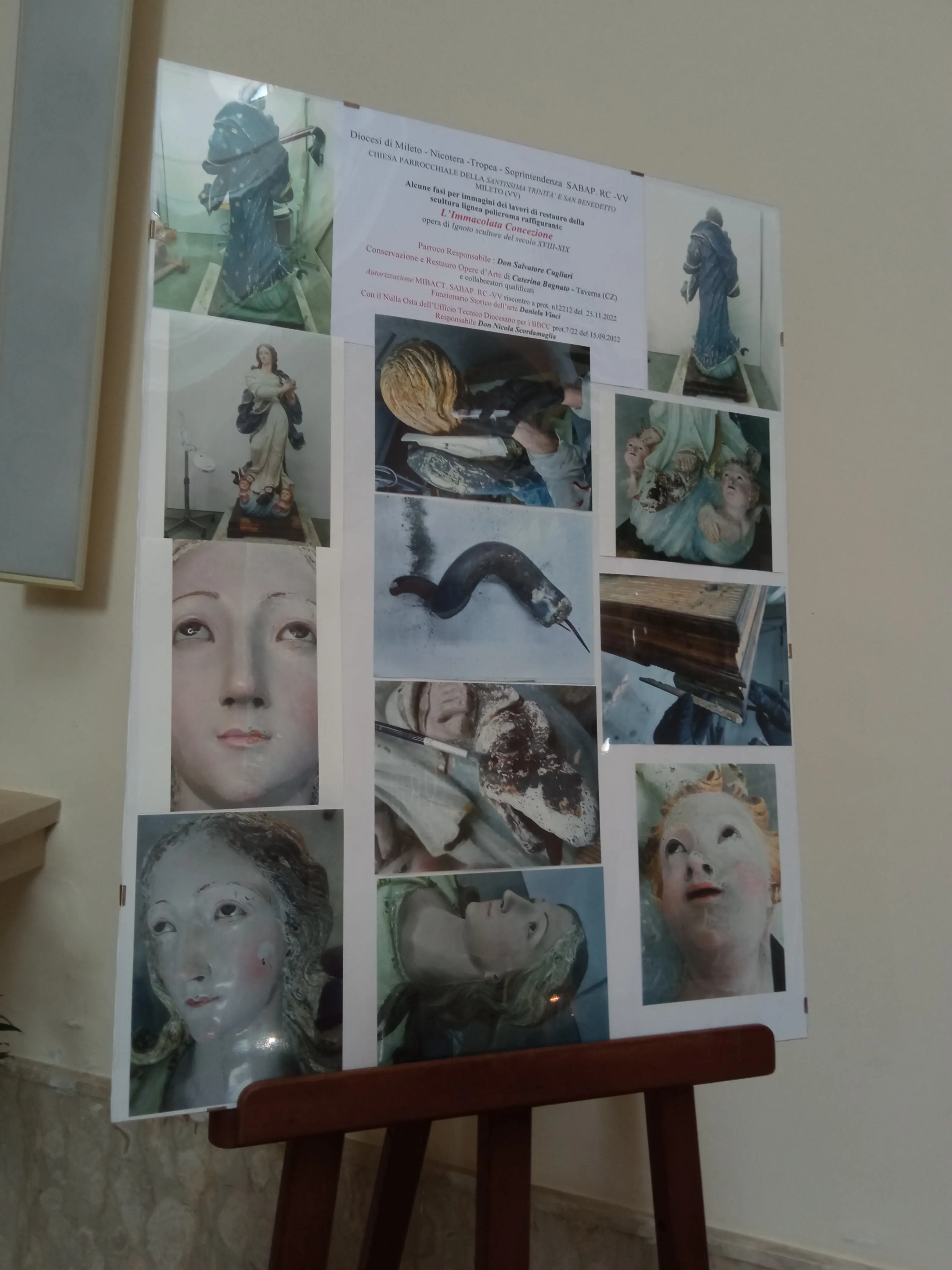 A spiegare i dettagli del complesso intervento di restauro è stata la stessa Bagnato, il giorno del ritorno della scultura della Vergine Maria nella chiesa matrice della Badia e della sua ricollocazione nell’apposita postazione, situata alla sinistra dell’altare. Una statua a prima vista in discreto stato di conservazione, ma che, al contrario, «in pratica occultava una generale compromissione, alterante i caratteri dell’intero modellato, dell’impianto strutturale e di quello conservativo e, di conseguenza, falsante l’estetica e la raffigurazione originale. Risanata l’opera in tutte le sue componenti materiche e raggiunta così un’unità di lettura scientificamente recuperata – ha sottolineato, tra l’altro, la restauratrice – la complessità del presente intervento è stata anche quella di portare, attraverso noti ed accreditati processi e metodi di cura, in luce ed equilibrio i caratteri tecnici esecutivi originali con le componenti storicizzate riferibili ai pregressi interventi di restauro, restituendo così la pregevole scultura lignea alla grande devozione popolare che caratterizza il culto dell’Immacolata Concezione nella sua comunità».