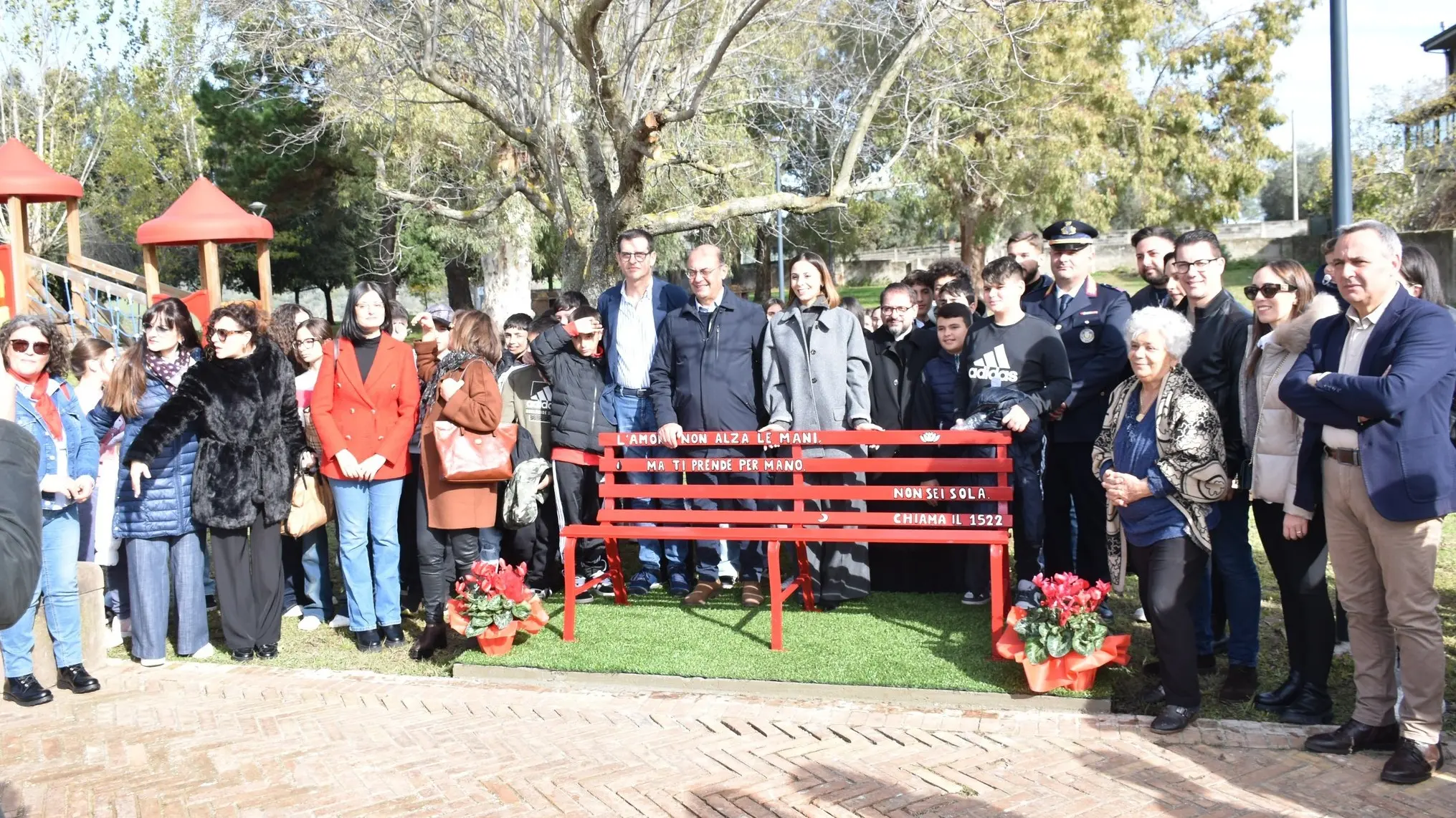Tra le prime, il sindaco Salvatore Fortunato Giordano e diversi esponenti di giunta, don Giuseppe Pititto, parroco “in solidum” della basilica cattedrale e responsabile della segreteria del vescovo della diocesi di Mileto-Nicotera-Tropea, monsignor Attilio Nostro, e il comandante di Polizia municipale, Francesco Adornato. A fare gli onori di casa, il presidente della Cooperativa sociale Atena Servizi, Cristian Vardaro, attuale ente gestore del parco pubblico attrezzato, il quale ci ha tenuto a ringraziare Ilenia Tulino per aver lanciato nelle scorse settimane l’idea di installare una panchina rossa che mantenga viva la memoria delle vittime e crei un monito costante contro la violenza di genere. «Abbiamo fatto subito nostro questo suggerimento - ha spiegato - e abbiamo deciso di muoverci in tal senso, nella convinzione che iniziative del genere possano aiutare a costruire una società migliore, in cui i valori della pace e del rispetto delle persone prevalgano su tutto».