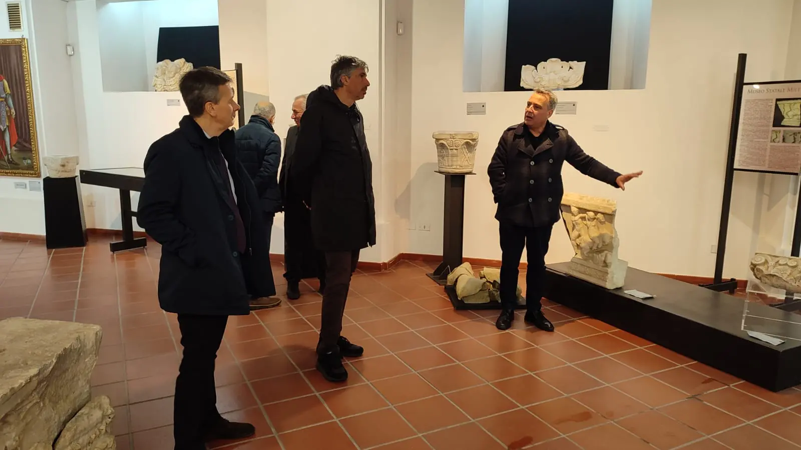 Successivamente il capo della Questura di Vibo Valentia ha potuto constatare di persona la valenza religiosa e architettonica dell’imponente basilica cattedrale, chiesa madre della diocesi di Mileto-Nicotera-Tropea, ma anche ammirare i capolavori artistici, storici e archeologici esposti all’interno del locale museo statale incastonato nell’ottocentesco Episcopio e diretto da Maurizio Cannata’, vero scrigno del glorioso trascorso dell’urbe, a metà dell’XI secolo elevata da Ruggero I d’Altavilla a capitale della propria contea normanna. Tra questi, i marmi di epoca romana, i trecenteschi sarcofagi Sanseverino, il turibolo in argento del XV secolo e la scultura eburnea del 1600 attribuita ad Alessandro Algardi, ritenuta prototipo di una serie di crocifissi sparsi in Italia e nel mondo. La visita del nuovo questore a Mileto si è conclusa con il cordiale e amichevole incontro avuto, all’interno della Curia, con il vescovo Attilio Nostro, insediatosi alla guida della diocesi nell’ottobre del 2021.