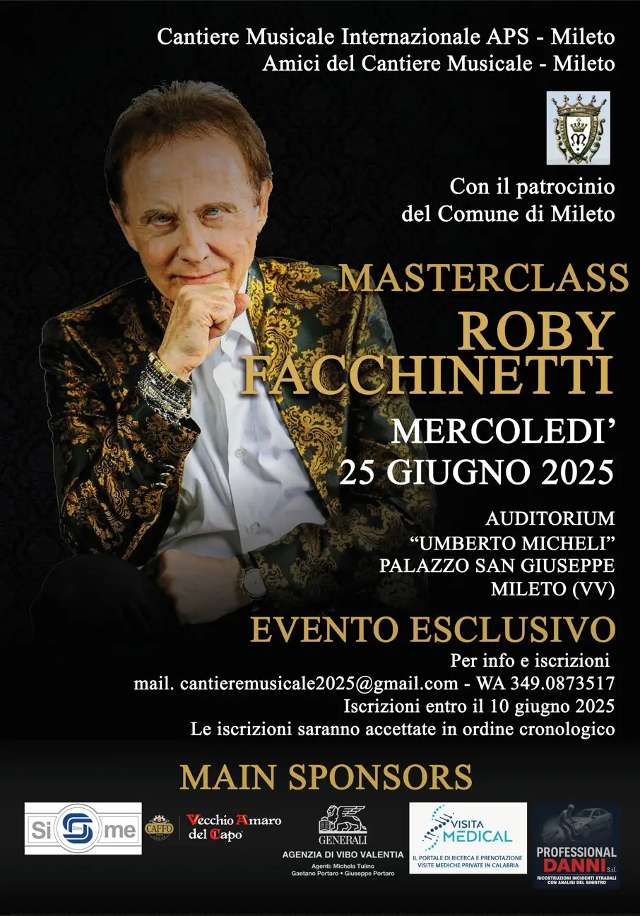 Il grande cantante dei Pooh Roby Facchinetti si accinge a ritornare nella “sua” Mileto. L’appuntamento è per il prossimo 25 giugno, giorno in cui la storica voce della mitica band italiana terrà la sua prima lezione nella cittadina normanna da maestro del Cantiere musicale internazionale Aps. Si tratta – spiegano i vertici della scuola di alta formazione fondata oltre dieci anni fa dal noto pianista Roberto Giordano – di un evento in esclusiva nazionale, che Roby Facchinetti ha fortemente voluto, dopo la promessa fatta a dicembre del 2023, quando ricevette la cittadinanza onoraria dall’Amministrazione comunale di Mileto guidata dal sindaco Salvatore Fortunato Giordano.