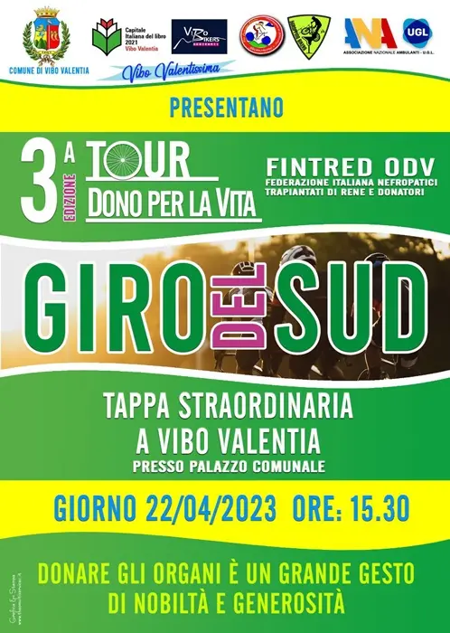 Farà tappa anche a Vibo Valentia il “Tour Dono per la vita – Giro del Sud”, iniziativa promossa dalla Federazione italiana nefropatici trapiantati di rene e donatori (Fintred) e sostenuta dall’Ana-Ugl, Associazione nazionale ambulanti. Proprio grazie al rapporto instauratosi tra l’amministrazione comunale di Vibo Valentia con l’assessorato alle Attività produttive e la Ana-Ugl è stato possibile inserire la tappa straordinaria di Vibo in questo speciale tour per la sensibilizzazione verso la donazione degli organi. Il presidente della Fintred, Giuseppe Iacovelli, è infatti partito in sella alla sua bici martedì 11 aprile per un viaggio in cinque regioni meridionali: percorrerà circa 1.100 km attraversando Lazio, Molise, Puglia, Basilicata e Calabria, fermandosi in molti Comuni per sensibilizzare l’opinione pubblica e le istituzioni sulla importanza della donazione degli organi come strumento per salvare vite umane e per alleviare le sofferenze di malati cronici. [Continua in basso]