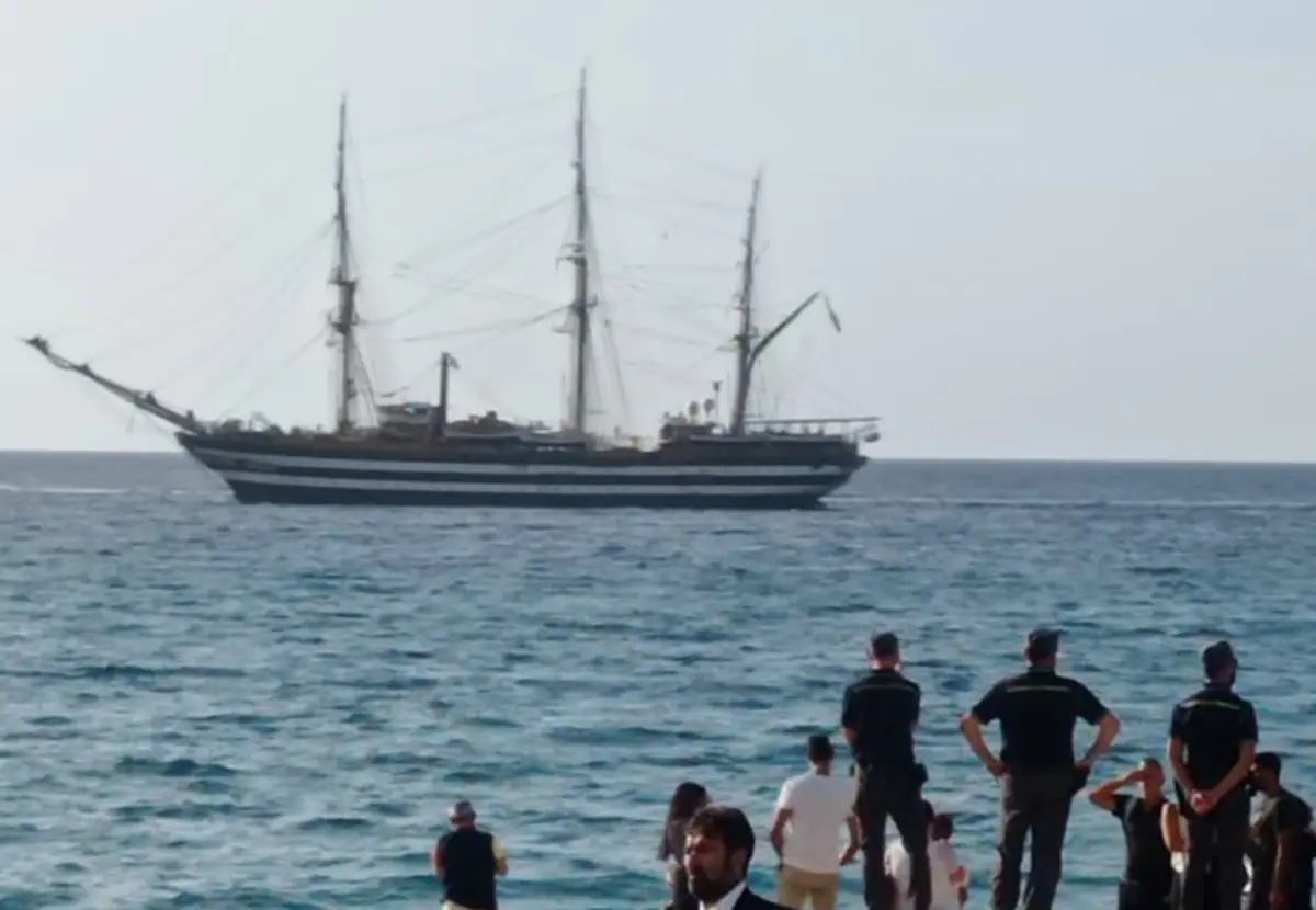 Sullo sfondo l’Amerigo Vespucci, la nave scuola vero e proprio orgoglio mondiale della Marina militare italiana. Solcando le acque di Pizzo, ha salutato il presidente della Repubblica con otto rintocchi della campana di bordo.