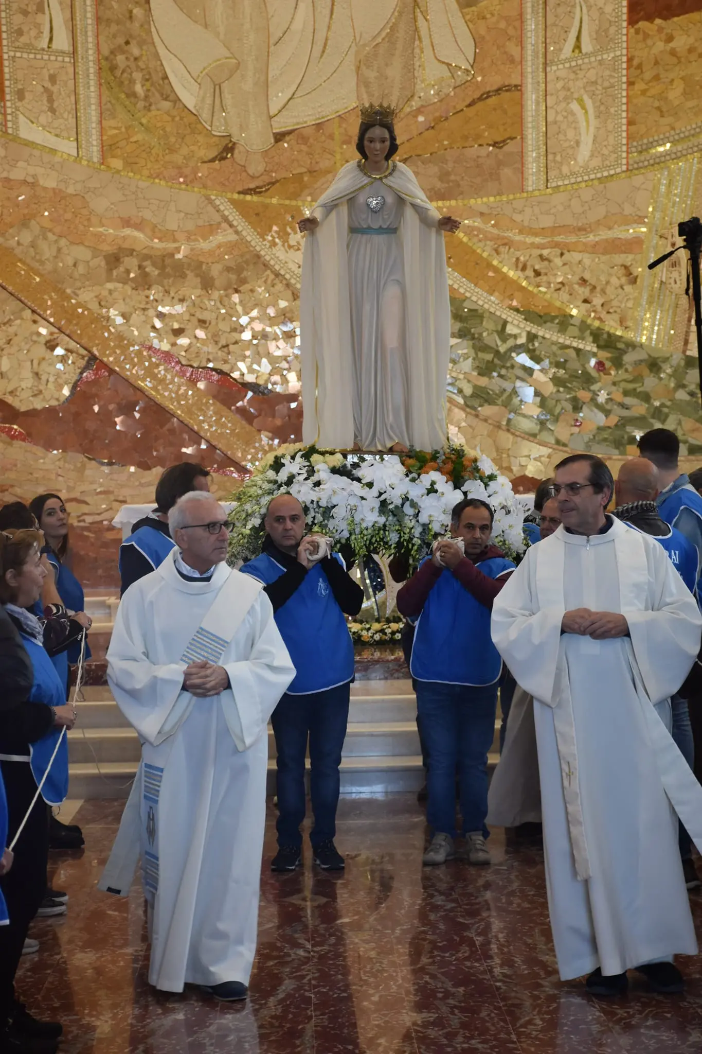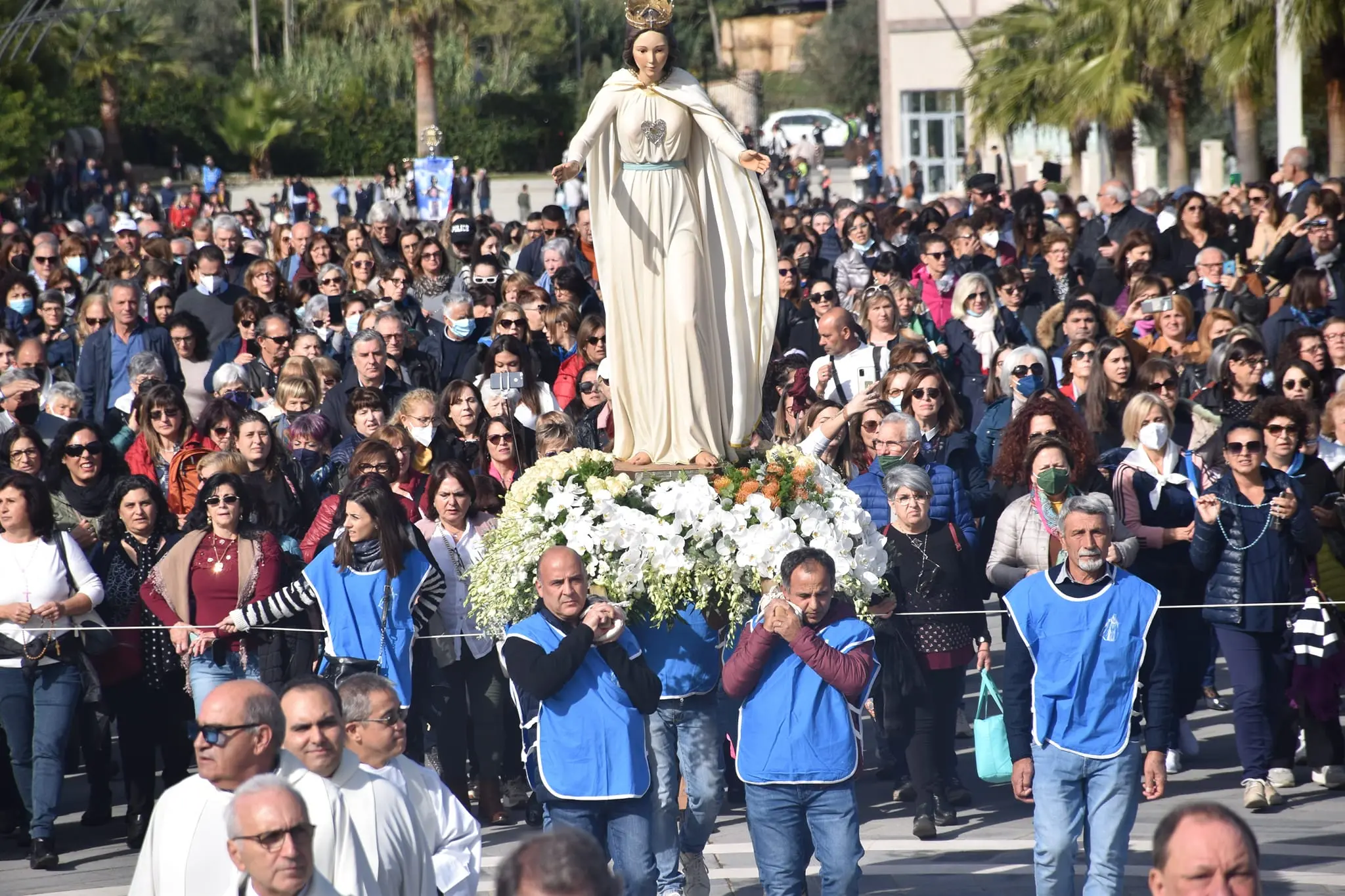 La pioggia battente abbattutasi nella notte e fino a prima mattina sul territorio aveva fatto presagire che il 29esimo anniversario dell’arrivo a Paravati della statua raffigurante la Madonna “Cuore Immacolato di Maria Rifugio delle Anime” sarebbe stato caratterizzato dal maltempo. Invece, ad accogliere i tanti pellegrini che si rifanno al carisma della Serva di Dio Natuzza Evolo è stata una splendida e, a quel punto, del tutto inaspettata giornata di sole. Nell’occasione, la Villa della Gioia è divenuta meta dei tantissimi appartenenti ai Cenacoli mariani che si ispirano alla mistica con le stigmate, provenienti dalla Calabria e da altre regioni d’Italia. Tant’è che la grande chiesa – preannunciata nel 1944 da Mamma Natuzza dalla Madonna e consacrata lo scorso 6 agosto – non è bastata a contenerli. Un buon numero di loro, infatti, ha dovuto partecipare alla celebrazione eucaristica delle 11.30 dal cortile esterno della Villa della Gioia. La messa presieduta dal vescovo della diocesi di Mileto Nicotera-Tropea, monsignor Attilio Nostro, è stata preceduta da quella delle 9 e dalla processione (iniziata alle 11 circa) della statua della Vergine nelle sembianze di una giovinetta, realizzata nel 1993 su indicazione della Serva di Dio, proprio così come ella la vedeva in vita nel corso delle numerose apparizioni. [Continua in basso]