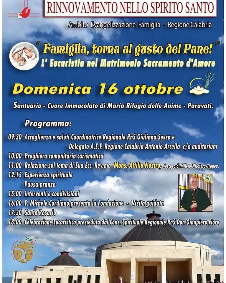 Sarà la Villa della Gioia di Paravati il luogo in cui gli aderenti all’ambito regionale Evangelizzazione famiglia del Rinnovamento dello Spirito si ritroveranno tutti insieme. L’evento, dal titolo “Famiglia torna al gusto del Pane! L’eucarestia nel matrimonio sacramento d’Amore”, si svolgerà domenica 16 ottobre all’interno della grande chiesa “Cuore Immacolato di Maria Rifugio delle Anime”, sorta nella spianata dell’omonima Fondazione per volontà della Serva di Dio Natuzza Evolo e da poco consacrata e apertura al culto. Il programma dettagliato dell’incontro prevede, alle 9.30, all’interno dell’Auditorium della casa per anziani “Monsignor Pasquale Colloca”, adiacente alla cappella che ospita la tomba della mistica con le stigmate morta il giorno di Ognissanti del 2009,l’accoglienza e i saluti ai partecipanti da parte della coordinatrice regionale del Rinnovamento dello Spirito, Giuliana Sessa, e del delegato Aef Calabria, Antonio Arcella. Seguiranno, alle 10 la preghiera comunitaria carismatica, alle 11 la relazione sul tema del vescovo della diocesi di Mileto-Nicotera-Tropea, monsignor Attilio Nostro, alle 12.15 l’esperienza spirituale. [Continua in basso]