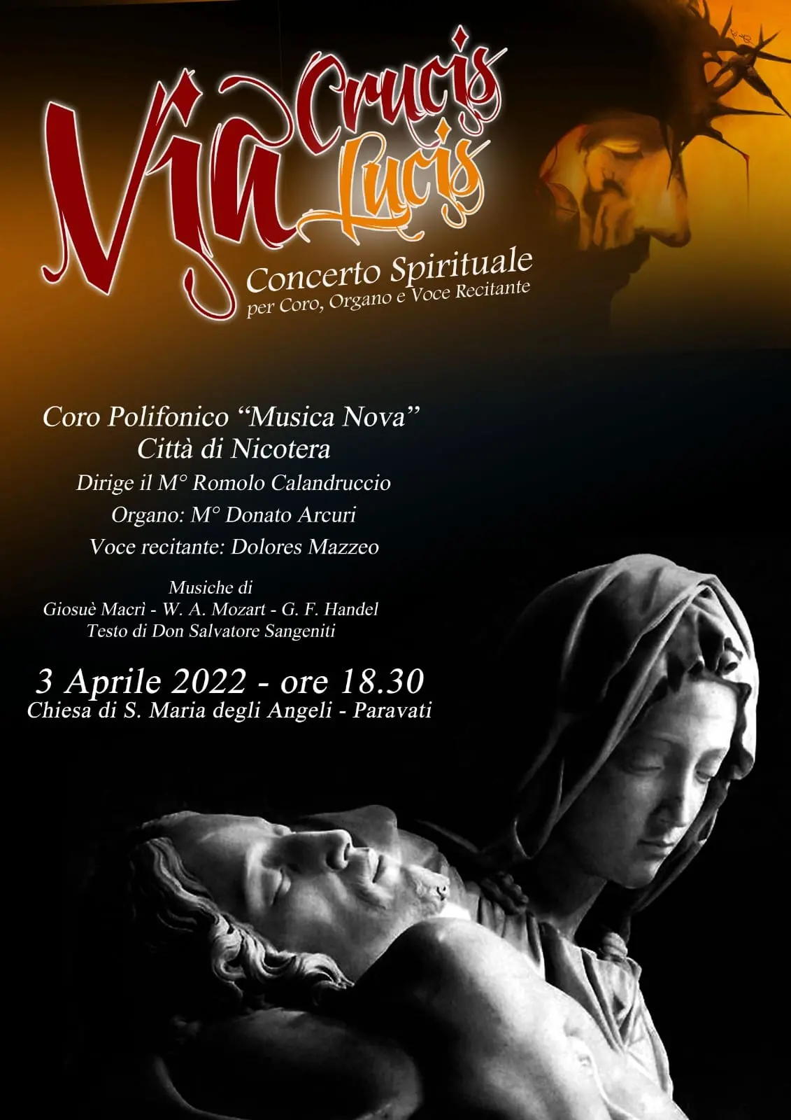 Conto alla rovescia per il concerto spirituale “Via Crucis Lucis” per coro, organo e voce narrante, in programma oggi 3 aprile alle 18.30 nella chiesa matrice della parrocchia “Santa Maria degli Angeli” di Paravati. Protagonisti dell’evento saranno il coro polifonico “Musica nova” di Nicotera, diretto dal maestro Romolo Calandruccio, il maestro d’organo Donato Arcuri e la voce narrante e attrice Dolores Mazzeo. Gli artisti e il coro, nell’occasione si esibiranno su musiche di Giosuè Macrì, Wolfgang Amadeus Mozart e George Friedrich Handel e testo di don Salvatore Sangeniti. Un compianto sacerdote, autore e poeta, quest’ultimo, morto prematuramente anni fa e, tra l’altro, alla guida per un lungo periodo della parrocchia “Santa Maria degli Angeli” di Paravati. Il concerto spirituale “Via Crucis Lucis” in programma nella chiesa matrice in cui è cresciuta e ha coltivato la sua fede la Serva di Dio Natuzza Evolo, si inserisce nella serie di eventi di musica sacra che la realtà parrocchiale guidata da don Domenico Muscari ha in programma in queste settimane di Quaresima e di avvicinamento alla Santa Pasqua. Tra l’altro, dopo il lungo periodo di restrizioni governative – dovuto al propagarsi della pandemia da Covid-19 – assume oggi una valenza che va oltre il significato prettamente religioso-artistico, ergendosi a simbolo di rinascita e di ritorno alla normalità dopo la lunga fase di crisi socio-economica, oggi aggravata anche dai venti di guerra provenienti dall’Ucraina.