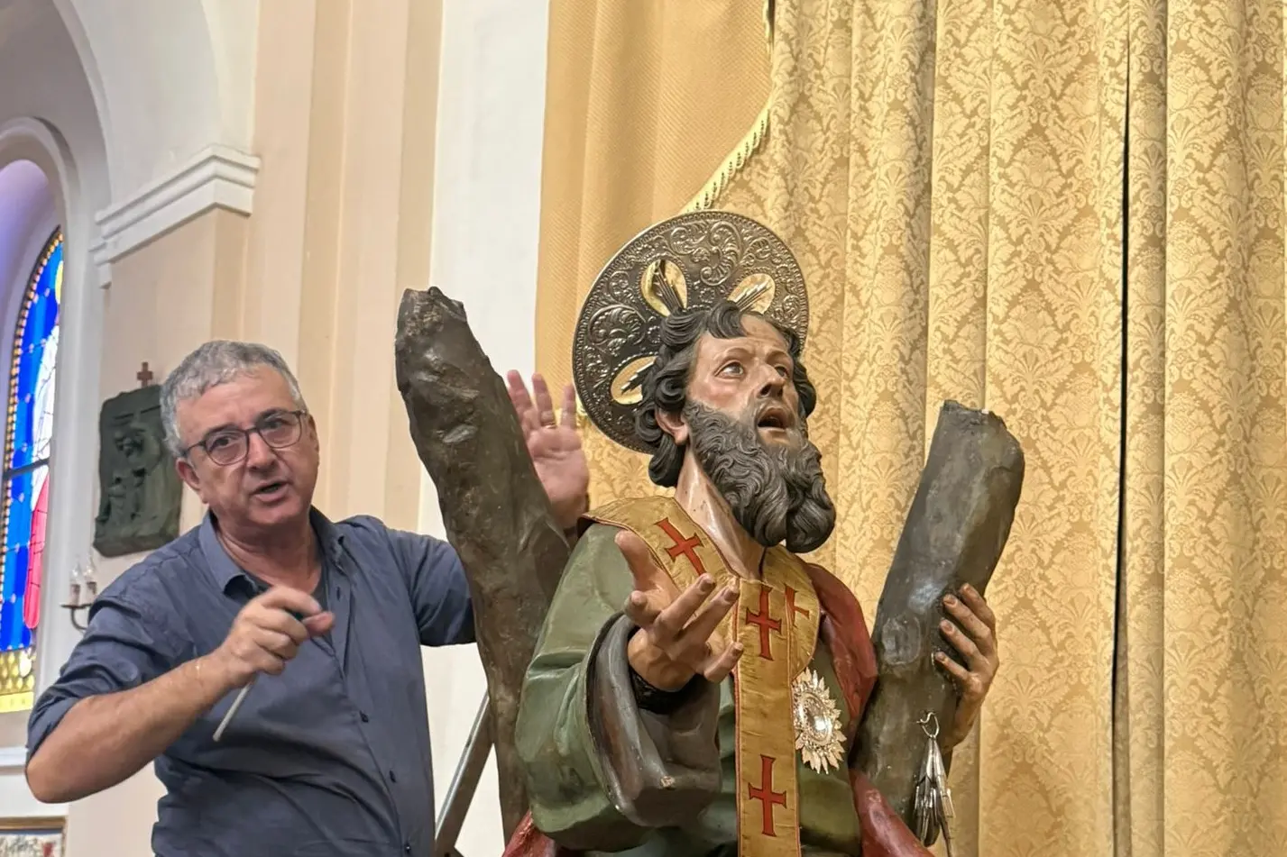 Un intervento che il valente artigiano del luogo ha realizzato in modo del tutto gratuito, spinto dalla grande devozione verso il santo patrono di Parghelia. Da qui i sentimenti di gratitudine espressi nei suoi confronti dalla comunità civile e religiosa della cittadina tirrenica. Non è la prima volta, tra l'altro, che il maestro Belvedere opera sulla pregevole statua di scuola napoletana di Sant'Andrea apostolo. Nei mesi scorsi, infatti, ha svolto un accurato intervento conservativo di ripulitura e lucidatura sul settecentesco reliquiario e sui pesci argentei che addobbano il simulacro. L'effigie raffigura il santo in abito verde scuro e con un mantello rosso che abbraccia la croce a forma di X posta sulle sue spalle. Nella mano sinistra tiene due pesci, sul petto un medaglione d'argento con all'interno una preziosa reliquia.