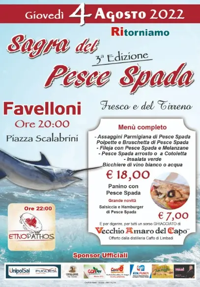 Un momento di convivialità ma con risvolti di solidarietà. Torna a Favelloni, frazione di Cessaniti, la Sagra del pesce spada. L’iniziativa, giunta alla sua terza edizione, punta ad offrire al piccolo centro una serata di svago. Non manca l’aspetto sociale. I fondi raccolti in occasione dell’evento enogastronomico, infatti, verranno utilizzati per proporre attività in oratorio da destinare ai bambini e ai ragazzi. Previsti specialità a base di pesce spada, piatti della tradizione calabrese e liquori locali. Ci sarà spazio per la musica con l’esibizione del gruppo folk Etnopathos.