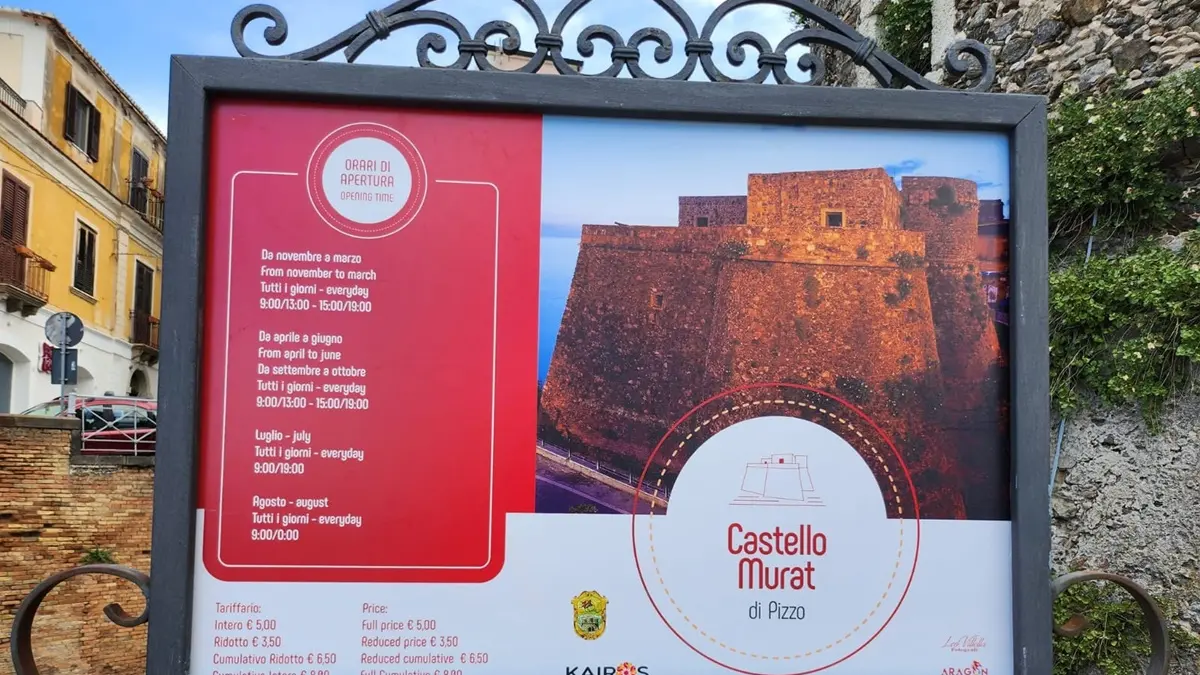Da qualche giorno davanti al maniero della seconda metà del XV secolo – in cui, nel 1815, fu imprigionato e condannato a morte per fucilazione il Re di Napoli Gioacchino Murat – campeggia un nuovo cartellone riportante le tariffe ora in vigore. La sostituzione del vecchio si sarebbe comunque resa necessaria, visto che esattamente una settimana fa lo stesso sarebbe stato preso di mira da vandali e danneggiato. L’episodio è stato reso noto e denunciato sui social da Francesco Pascale, presidente dell’associazione Kairos Pizzo che si occupa della gestione del Castello Murat e Piedigrotta. L’autore del gesto sarebbe stato immortalato dalle telecamere. È seguita formale denuncia.