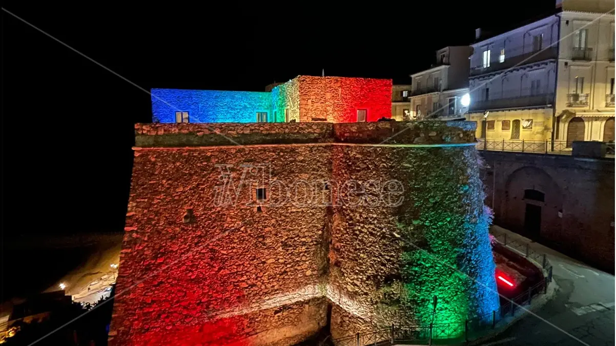 Il castello Murat di Pizzo Calabro ieri sera, alla fine di una giornata caratterizzata da avvenimenti che hanno destato apprensione in tutto il mondo, si è illuminato con i colori arcobaleno della pace.