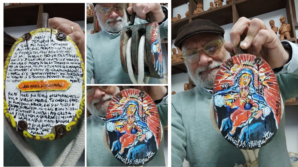 L’inesauribile fantasia di Antonio Montesanti, di Vibo Marina ma con bottega d’arte a Pizzo, questa volta ha preso la forma di un bozzello di manovra, appartenuto ad un veliero del 1910, su un lato del quale è stata riprodotta una raffigurazione della Madonna di Piedigrotta e, sull’altro lato, la versione condensata, per motivi di spazio, di un’antica preghiera popolare in dialetto pizzitano. «Le preghiere sono lunghe – spiega il cultore delle tradizioni popolari – per cui nel bozzello di manovra ne ho potuto scrivere solo alcuni brani per via dello spazio ridotto, ma anche così mantengono intatta la loro carica emotiva di fede e di speranza nell’intercessione benigna della Madonna. Simbolicamente il bozzello rappresenta il veliero naufragato dinanzi alle coste di Pizzo, naufragio che poi diede vita alla edificazione della chiesetta ipogea della Madonna». [Continua in basso]