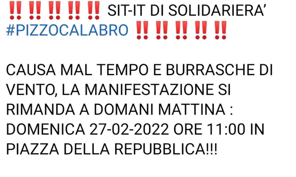 Causa maltempo e burrasche di vento, la manifestazione di solidarietà prevista per le 18 in piazza della Repubblica a Pizzo per dire “No alla guerra”, è stata rinviata a domani mattina alle ore 11.