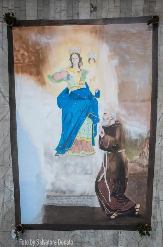 Volgono al termine i festeggiamenti in onore della Madonna delle Grazie a Pizzoni. Nella notte un gruppo di giovani fedeli capitanati dall’artista Adriano Fusca’ e da Lisetta Donato hanno realizzato nella piazza antistante la chiesa una tela gigante raffigurante Maria S.S. delle Grazie e San Pio da Pietrelcina che i tanti fedeli arrivati dai paesi vicini hanno molto apprezzato.