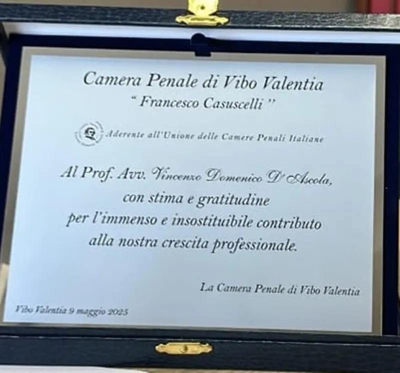 A margine dell’evento, la Camera Penale vibonese ha voluto omaggiare l’avvocato Vincenzo Domenico D’Ascola con una targa per esprimere tutta la gratitudine dei penalisti vibonesi al professore di diritto calabrese che ha contribuito alla loro crescita professionale.