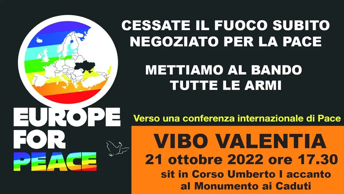 «La coalizione Europe for Peace, formata dalle principali reti per la pace in Italia con l’adesione di centinaia di organizzazioni, è profondamente preoccupata per l’escalation militare che ha portato il conflitto armato alla soglia critica della guerra atomica, e questo mentre la crisi economica si abbatte sulle fasce più deboli delle popolazioni europee (aggravata dalle speculazioni sul costo dell’energia), le industrie e i commercianti di armi fanno affari e moltiplicano i propri guadagni. La Cgil Area Vasta Catanzaro-Crotone-Vibo aderisce alla mobilitazione lanciata da Europe for Peace e torna nelle piazze venerdì 21 ottobre con un iniziative organizzate con altre associazioni per chiedere percorsi concreti di Pace in Ucraina e in tutti gli altri conflitti armati del mondo». Ad annunciarlo, il segretario generale della Cgil Area Vasta Catanzaro-Crotone-Vibo, Enzo Scalese. Questo pomeriggio, dunque, alle ore 17.30 a Catanzaro ci sarà un corteo che partirà da Prefettura mentre in Corso Umberto a Vibo Valentia (accanto al Monumento ai Caduti) la Cgil Area Vasta sarà in piazza con un sit in: entrambe le manifestazioni saranno per la pace e a un sostegno ad azioni multilaterali, le uniche capaci di «portare una vera democrazia globale, a partire dalla volontà di pace della maggioranza delle comunità e dei popoli». [Continua in basso]