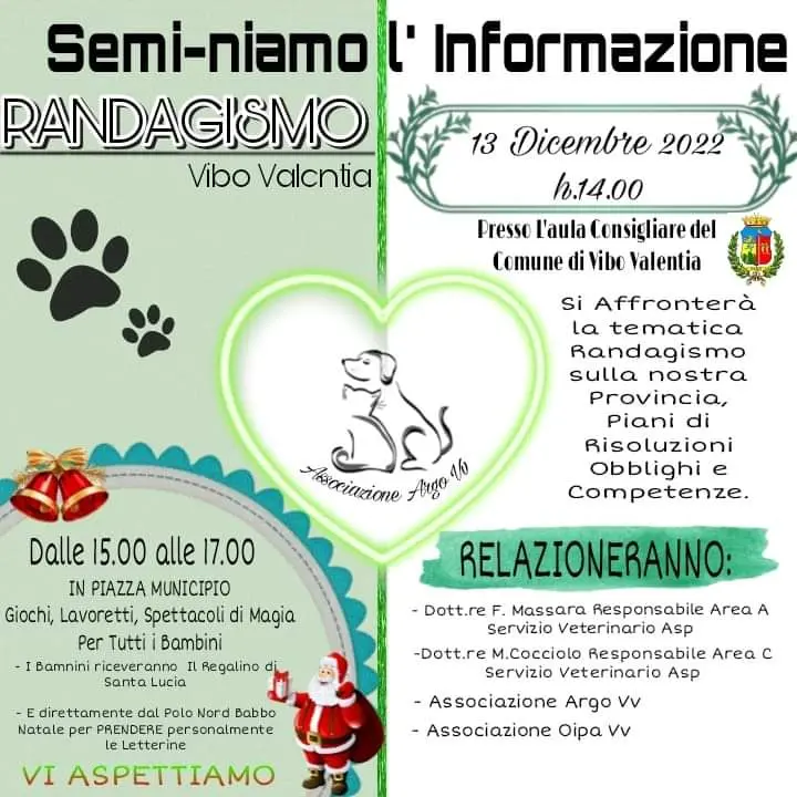In relazione all’importante tematica verranno spiegati obblighi, competenze, che hanno Comuni, Asp e autorità, saranno illustrati piani di prevenzione e i sistemi adottati per cercare di arginare questo fenomeno. Relazioneranno i dottori Francesco Massara, Responsabile Area A Asp (Randagismo) e Domenico Cocciolo, Responsabile Area C Asp (Benessere Animale) . Le Associazioni Argo VV e Oipa VV, illustreranno le problematiche viste con gli occhi di chi tutti i giorni opera sul campo del volontariato. All’ incontro sono stati invitati a partecipare tutti i sindaci del Vibonese. “La loro presenza è fondamentale per trovare una sinergia nella lotta al randagismo, – hanno spiegato gli organizzatori – oltre a essere rassicurante per i cittadini del comune che rappresentano. L’incontro sarà trasmesso anche in diretta sui nostri canali ufficiali e per mezzo stampa, affinché la cittadinanza possa intervenire con domande e dubbi che sottoporremo ai diretti interessati. Inoltre, – hanno concluso – dalle ore 15 alle 17, l’associazione ha organizzato dei progetti di sensibilizzazione che coinvolgeranno i bambini in piazza Municipio, con giochi, spettacoli di magia e l’arrivo di Babbo Natale.“