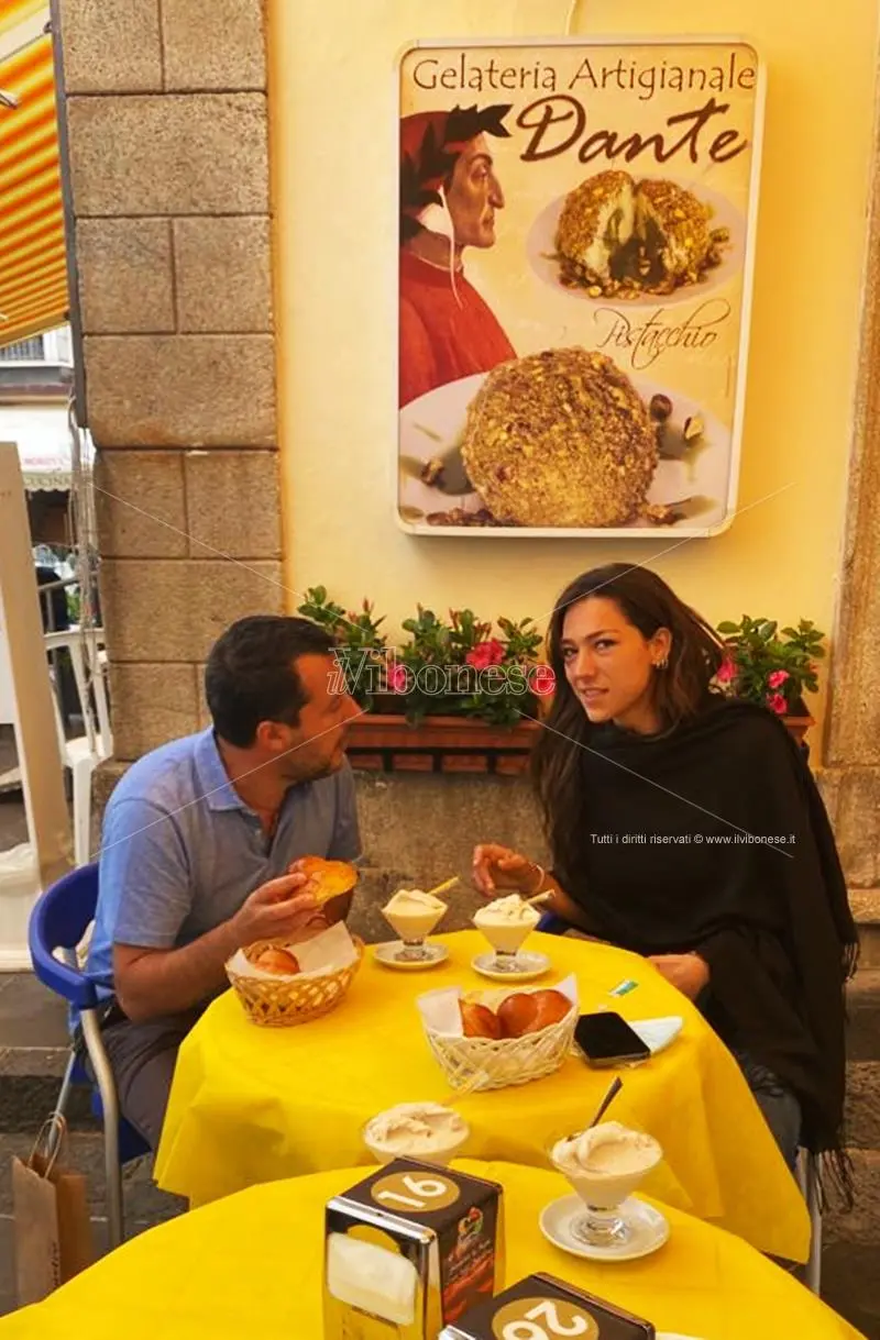 Matteo Salvini non ha resistito alla tentazione del gelato e della granita di Pizzo. Questa mattina, infatti, prima di raggiungere Zambrone dove è in corso la tre giorni degli stati generali della Lega, il leader del Carroccio ha fatto tappa a Pizzo in piazza della Repubblica. Accompagnato dalla fidanzata Francesca Verdini, ha degustato la “murzunata” (granita con le mandorle) con la brioche. La tipica colazione pizzitana ha conquistato anche l’ex ministro dell’Interno che, dopo qualche selfie e una passeggiata fino allo Spuntone, ha ripreso il suo viaggio con destinazione Zambrone per concludere la convention della Lega.