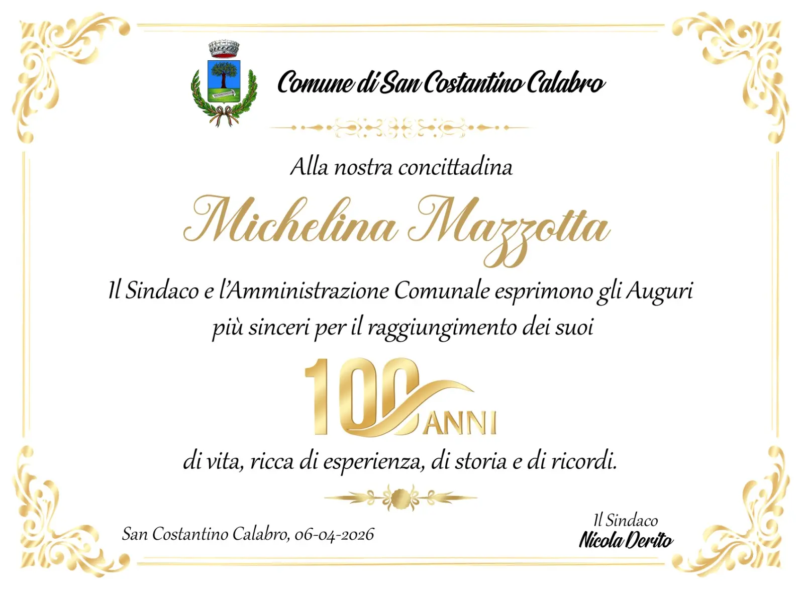 «La signora Michelina - aggiunge Derito - rappresenta la memoria storica della nostra comunità e un esempio di vita per le nuove generazioni. Una donna pacata, gentile e, tuttavia, caratterizzata dal forte temperamento di chi ha vissuto le difficoltà del secolo scorso. Ha affrontato la vita con coraggio e dignità - conclude - circondata dall'affetto dei suoi cari, delle figlie e dei nipoti, dimostrando sempre tanto affetto e amore per la famiglia. A lei va l'abbraccio riconoscente di tutta la comunità di San Costatino, con l'augurio di continuare a vivere in serenità e salute».