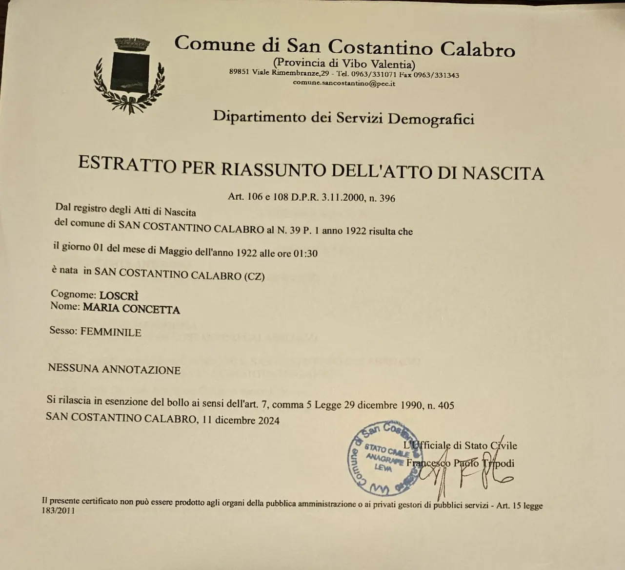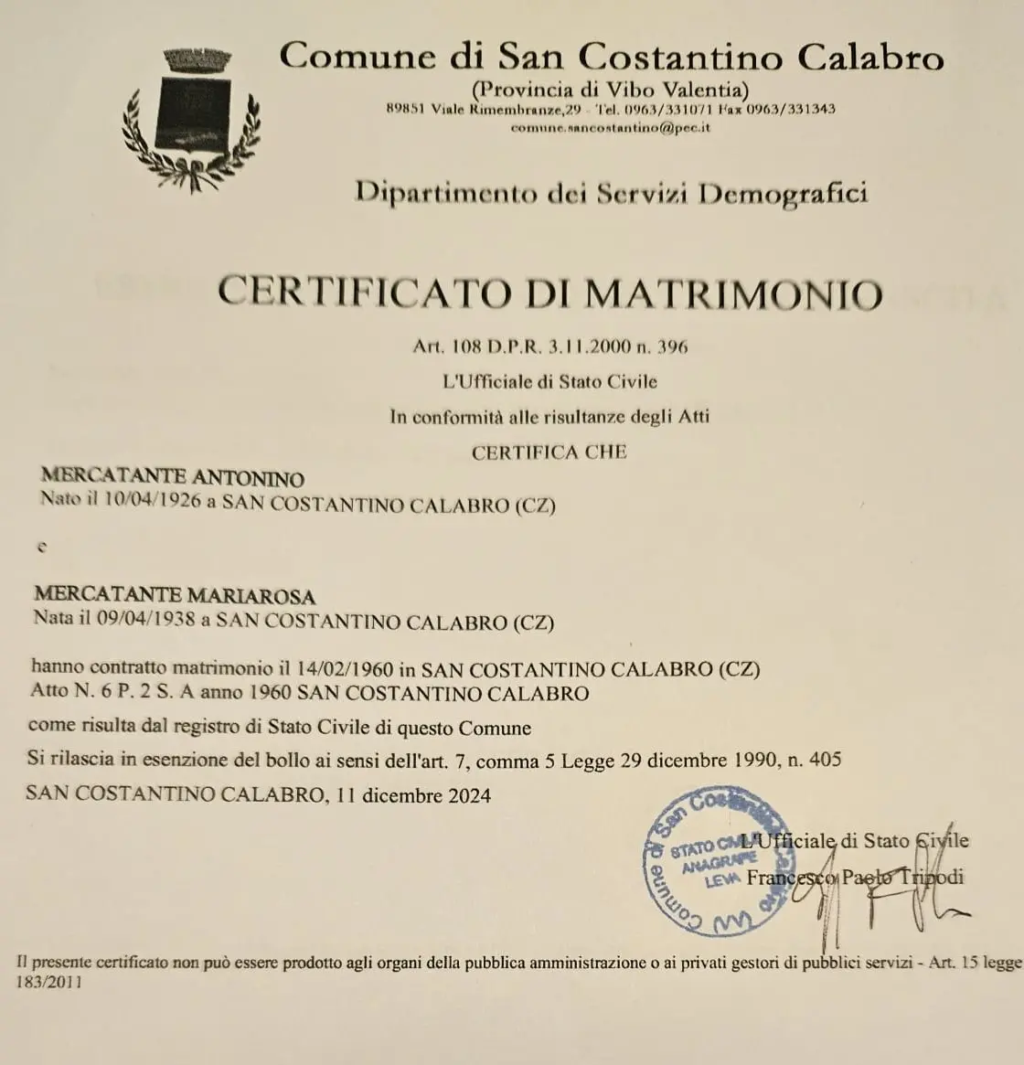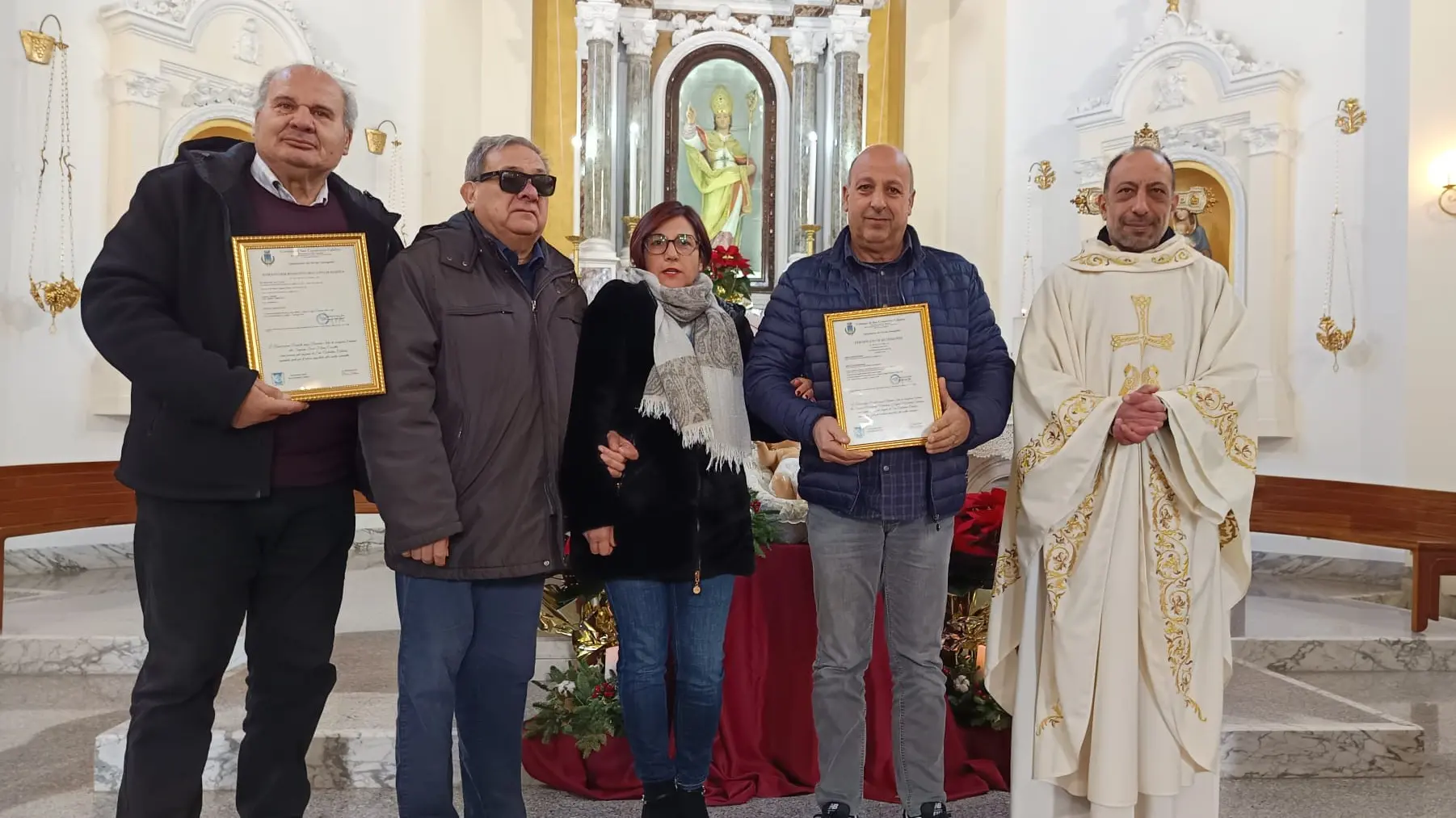 Donare nel giorno in cui la Chiesa universale festeggia la Sacra Famiglia di Giuseppe, Maria e Gesù un riconoscimento speciale alla persona più anziana del luogo e alla coppia da più anni unita in matrimonio a San Costantino Calabro. Questa la bella e pregevole idea portata a compimento dalla locale associazione Disabili senza barriere presieduta dall’attivo Rocco Deluca. A ricevere il premio sono stati, nello specifico, la 102enne Maria Concetta Loscrì e i coniugi Antonino Mercatante e Mariarosa Mercatante, quest’ultimi sposi da ben 65 anni. A loro la realtà associativa di terzo settore ha nell’occasione assegnato i rispettivi certificati originali dell’atto di nascita e di matrimonio. Vista l’età, a ricevere i premi sono stati alcuni familiari, nel corso della celebrazione eucaristica presieduta nella chiesa matrice di San Costantino Calabro dal parroco don Oreste Borelli.