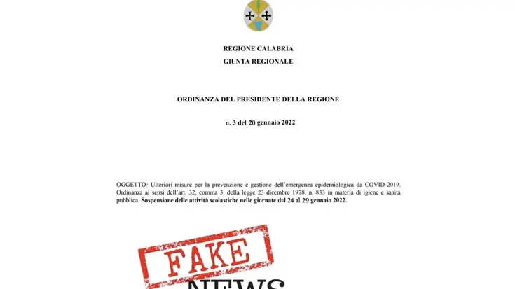 Aveva già iniziato a rimbalzare da un gruppo whatsapp all’altro, ma è stata subito smentita dalla Regione Calabria e bollata come una fake news. Si tratta di una fantomatica ordinanza regionale numero 3, che dispone la chiusura di tutte le scuole del territorio regionale dal 24 al 29 gennaio 2022. Per verificarne la veridicità, sarebbe bastato andare sul sito della Regione per rendersi conto che l’ultima ordinanza è la numero 7 del 18 gennaio relativa al Green pass base per l’attraversamento dello Stretto. Nel primissimo pomeriggio è comunque arrivata anche la smentita della Regione.