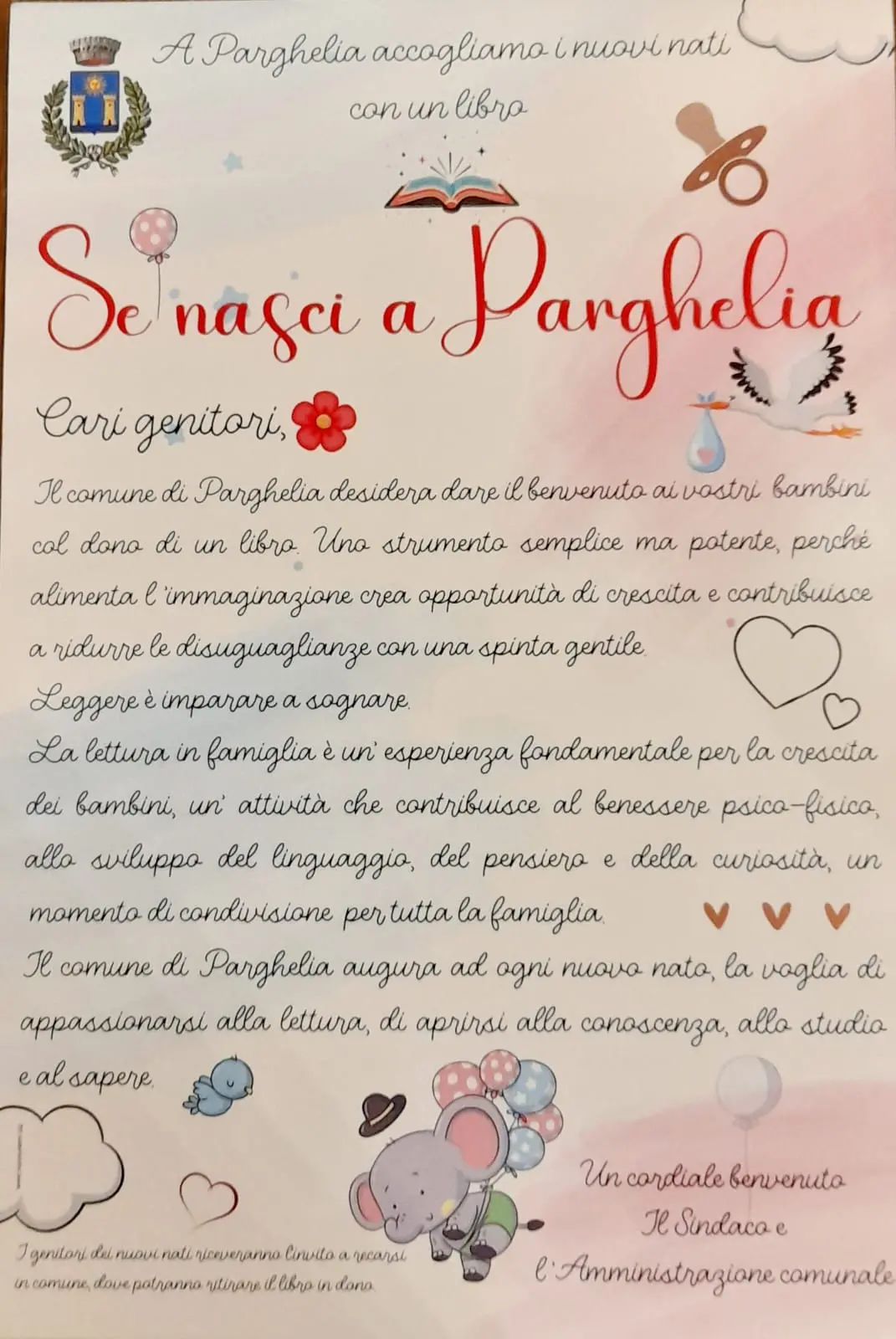 «Il Comune di Parghelia – si legge nella locandina dell’iniziativa a firma del sindaco – desidera dare il benvenuto ai vostri bambini col dono di un libro. Uno strumento semplice ma potente, perché alimenta l’immaginazione, crea opportunità di crescita e contribuisce a ridurre le disuguaglianze con una spinta gentile. Leggere è imparare a sognare. La lettura in famiglia è un’esperienza fondamentale per la crescita dei bambini, un’attività che contribuisce al benessere psico-fisico, allo sviluppo del linguaggio, del pensiero e della curiosità, un momento di condivisione per tutta la famiglia. Il Comune di Parghelia augura a ogni nuovo nato la voglia di appassionarsi alla lettura, di aprirsi alla conoscenza, allo studio e al sapere».