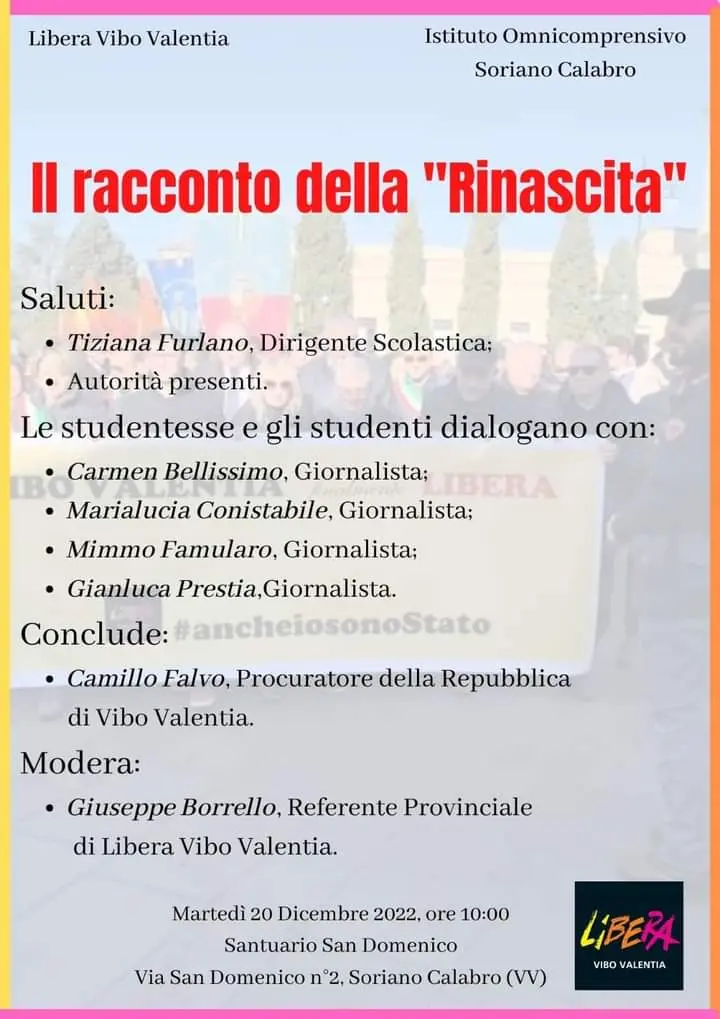 A distanza di tre anni dall’operazione “Rinascita Scott” e dalla manifestazione del 24 dicembre 2019, “Vibo Valentia, finalmente Libera”, il coordinamento provinciale di Libera unitamente all’Istituto Omnicomprensivo di Soriano Calabro, ha organizzato “Il racconto della Rinascita”, un incontro tra scuole, giornalisti e istituzioni che sarà “un momento di confronto tra gli studenti e i giornalisti impegnati quotidianamente a raccontare la nostra provincia – ha reso noto Libera Vibo – al fine di tenere vivi i sentimenti e le emozioni di quegli eventi con uno sguardo rivolto ai giorni nostri e alle prospettive del nostro territorio”. Alla manifestazione, che si terrà domattina alle 10 all’interno del Santuario di San Domenico di Soriano Calabro, parteciperà il procuratore della Repubblica di Vibo Valentia, Camillo Falvo, al quale saranno affidate le conclusioni del dibattito tra gli studenti e i giornalisti Carmen Bellissimo, Marialucia Conistabile, Gianluca Prestia e Mimmo Famularo. L’evento sarà moderato da Giuseppe Borello, referente di Libera Vibo e vedrà la partecipazione delle Autorità locali e della dirigente scolastica Tiziana Furlano.