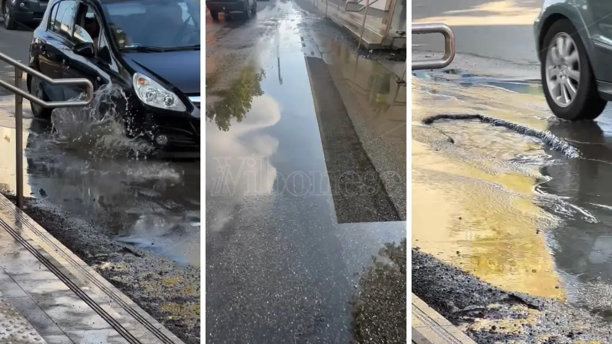 Carenza idrica? Non alla stazione di Vibo Valentia-Pizzo. O meglio, non davanti alla stazione dove l’acqua per strada è così tanta che si è formato un vero e proprio lago. Un piccolo lago, ormai lì da settimane, che mette in pericolo l’incolumità di automobilisti e pedoni. I primi infatti rischiano di non vedere una maxi buca che si è creata proprio davanti all’ingresso dello scalo ferroviario più importante della provincia, e di finirci dentro con la possibilità di spaccare una ruota. L’acqua, che come mostra il video che vi proponiamo sembra sgorgare da una crepa nell’asfalto, bagna poi gli scalini d’accesso alla stazione con il rischio per chi ci sale o scende di scivolare e cadere rovinosamente.