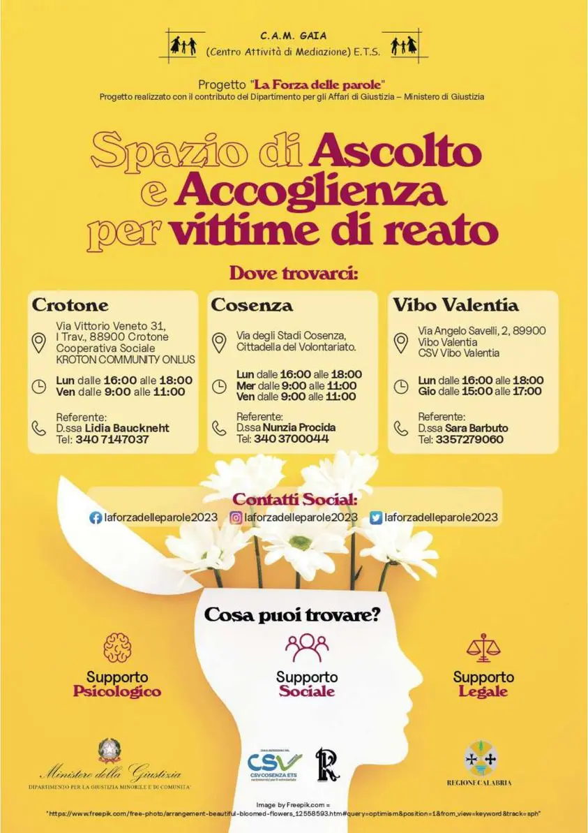 Che cosa si intende per “vittima”?: «Si tratta di una persona che ha subito un danno, anche fisico, mentale o emotivo o perdite economiche che sono stati causati direttamente da un reato; un familiare di una persona la cui morte è stata causata direttamente da un reato e che ha subito un danno in conseguenza della morte di tale persona (art. 2 Direttiva 2012/29/Ue del Parlamento europeo e del Consiglio del 25 ottobre 2021)». L’obiettivo «è di offrire nell’immediato una soluzione concreta alla domanda di giustizia, dando un sostegno sia ai vissuti emozionali sia ai bisogni materiali delle parti offese attraverso l’attivazione gratuita di punti di ascolto, supporto legale e psicologico». Le azioni previste prevedono la «costruzione di un servizio di assistenza alle vittime di reato, con il coinvolgimento in una rete virtuosa di soggetti pubblici e privati, che condividono la principale finalità di dare ascolto e sostegno alle persone che subiscono le conseguenze di un reato, che assicurino soluzioni tempestive e concrete alla richiesta di giustizia». Pertanto le attività vengono rivolte alle persone che «hanno la necessità di reperire punti di riferimento che consentano loro di far fronte alle conseguenze del reato subito. In casi particolari sarà possibile avere anche un piccolo sostegno economico». Si punta anche alla «informazione sui diritti: strumento a disposizione della vittima attraverso il quale prima o dopo la denuncia/querela, ha la possibilità di interfacciarsi con un operatore per ricevere attraverso l’informazione, una prima forma di tutela legale e sociale». I servizi vengono erogati tramite i punti o sportelli di ascolto che forniscono anche «percorsi personalizzati di tipo psicoterapeutico quali: Ama e/o in percorsi “Famiglia di”: percorsi di sostegno ai familiari dei rei in sperimentazione». Altre azioni che verranno messe in campo: «Attivazione della rete di vittime aspecifiche connesse alle istituzioni del territorio per l’implementazione di victim panel e per promuovere l’informazione e sensibilizzazione di diritti delle parti offese anche nei contesti penali con la finalità di prevenzione terziaria». E poi la «realizzazione di cicli di sensibilizzazione a specifiche comunità del territorio calabrese in sinergia con le commissioni locali sulle pari opportunità, vittime della subcultura ‘ndranghetista attraverso azioni di supporto con particolare riferimento alla condizione della donna e Lgbt». Quindi «l’implementazione della rete tra tutti i partner istituzionali, Magistratura, Istituzioni pubbliche ed il coinvolgimento attivo degli ordini professionali e del mondo dell’associazionismo».