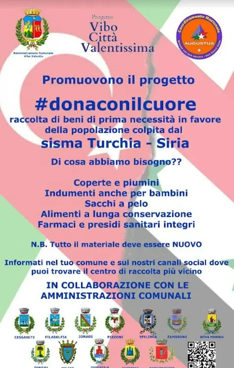 Per il sindaco Maria Limardo “è doveroso fare la propria parte con un contributo, anche minimo, che però significa tanto per chi in questo momento non ha niente”. In particolare, potranno essere consegnati presso il centro di raccolta individuato nel mercato delle clarisse, a Vibo Valentia, ogni lunedì, mercoledì e venerdì dalle ore 15 alle 18: generi alimentari, esclusivamente a lunga scadenza e non deperibili; beni per l’igiene personale e per la pulizia; prodotti per primo soccorso e medicinali; inoltre sacchi a pelo, coperte termiche e torce elettriche.