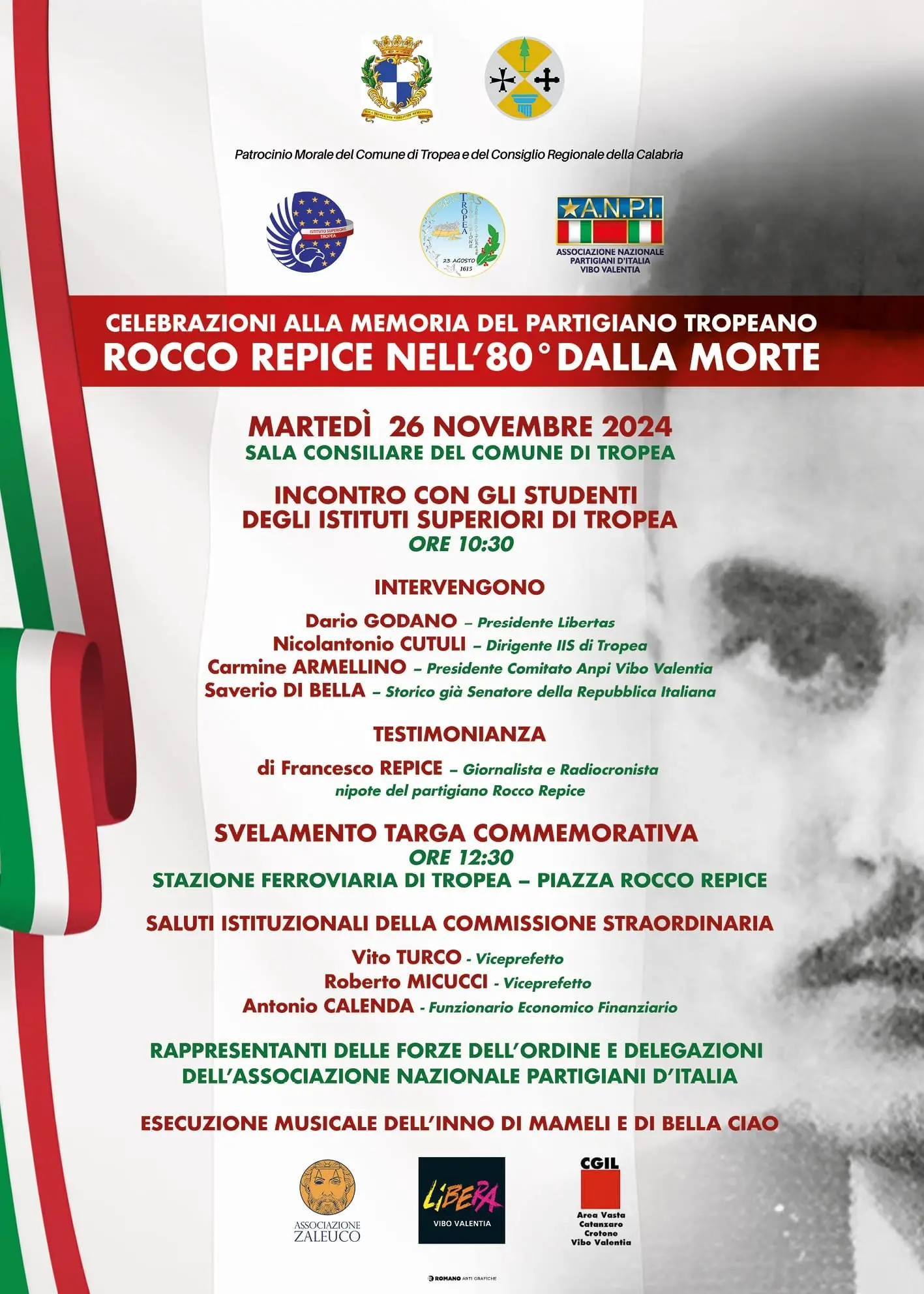 Alle ore 12:30 «nella piazza antistante la Stazione ferroviaria di Tropea, da poco intestata proprio a Rocco Repice, sarà svelata la targa commemorativa al cospetto delle commissione straordinaria del Comune di Tropea, composta dai viceprefetti Vito Turco e Roberco Micucci e dal responsabile finanziario Antonio Calenda, dei rappresentanti delle forze dell’Ordine, delle delegazioni dell’Anpi e dei familiari di Rocco Repice. Seguirà l’esecuzione musicale dell’inno nazionale “Fratelli d’Italia”, di “Bella Ciao” e di “Fischia il vento”. La manifestazione – conclude il documento – si pregia del patrocinio morale del Consiglio regionale della Calabria e del Comune di Tropea, dell’adesione dell’associazione Zaleuco Onlus, di Libera-Vibo Valentia e della Cgil».