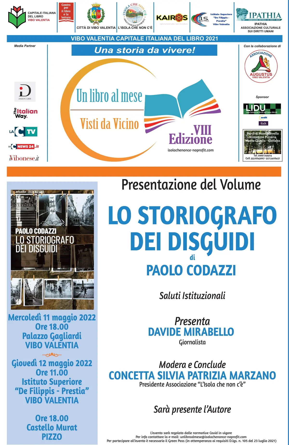 Vibo Valentia Capitale Italiana del Libro, nella rassegna “Un libro al mese. Visti da Vicino”, ospita l’11 maggio, a Palazzo Gagliardi, Paolo Codazzi, ideatore e presidente del Premio Letterario Chianti. Scrittore fiorentino è un abituée della rassegna nella quale ha presentato, in anteprima nazionale, nel 2014 “La farfalla asimmetrica” e nel 2017 “Il pittore di ex-voto”. Importante autore della letteratura contemporanea, torna a Vibo con la sua ultima fatica letteraria “Lo storiografo dei disguidi”, una raccolta di racconti apparentemente legati tra loro da una particolarissima visione della realtà, nella quale il lettore viene accompagnato tra contesti cittadini e ambienti familiari della sua bella Firenze. A presentare il volume Davide Mirabello, giovane e nota firma del giornalismo calabrese. A moderare e concludere l’incontro Concetta Silvia Patrizia Marzano, ideatrice della rassegna e presidente dell’associazione “L’Isola che non c’è”. Con l’appuntamento con Codazzi l’associazione organizzatrice della rassegna offre un piccolo spiraglio di osservazione a quella che sarà la prossima attività letteraria che avrà prosecuzione oltre il periodo di nomina di Vibo Capitale, che invece si concluderà con le consegne durante il Salone del libro di Torino. Infatti, dopo la presentazione dell’11 a Palazzo Gagliardi, il 12 maggio autore e volume saranno ospiti dell’Istituto “De Filippis-Prestia” alle ore 11 per una conversazione con docenti e discenti. L’istituto non è nuovo a tali attività poiché negli anni scorsi ha ospitato diversi autori proprio della stessa rassegna.
