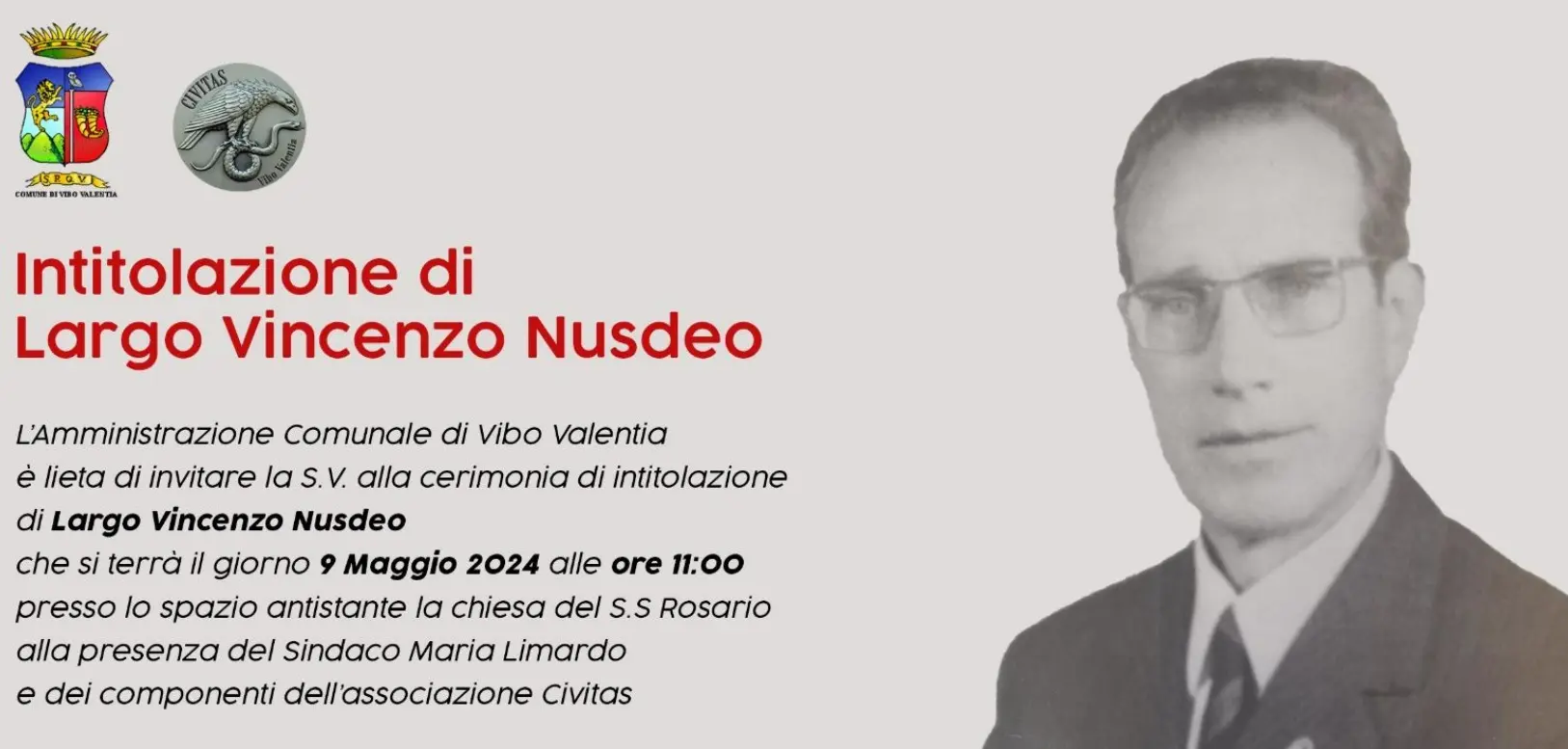 Un’intera giornata in memoria di Vincenzo Nusdeo. Nel venticinquesimo della sua morte, la Città di Vibo Valentia lo ricorda nel giorno del suo compleanno essendo nato il 9 maggio 1906. Grazie all’attività dell’Associazione Civitas presieduta da Raniero Pacetti, è stato realizzato per il 9 maggio un programma di eventi che si aprono la mattina alle ore 11.00 quando il sindaco Maria Limardo scoprirà la targa nel luogo che da questo momento sarà individuato quale Largo Vincenzo Nusdeo, come da delibera comunale. La cerimonia di intitolazione si terrà nello spazio antistante la Chiesa del S.S. Rosario, proprio lì dove Vincenzo Nusdeo ha vissuto ed ha avviato, subito dopo la seconda guerra mondiale, un centro di analisi cliniche, contribuendo in tal modo a rendere localmente la sanità più a portata dei cittadini.