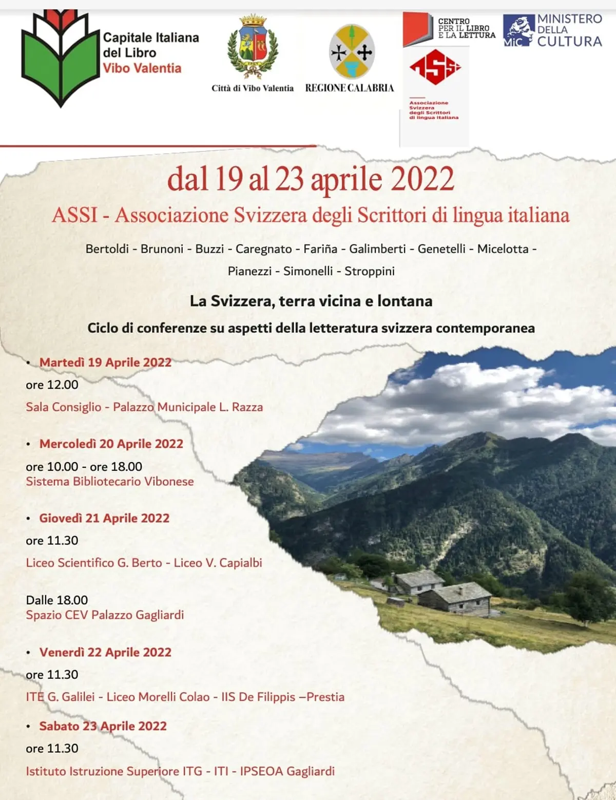 Vibo Capitale del libro incontra la Svizzera. Da oggi al 23 aprile il capoluogo ospiterà undici scrittori svizzeri di lingua italiana provenienti dalla Svizzera italiana, francese e tedesca che terranno una serie di conferenze in tutte gli istituti superiori della città, presso il Sistema bibliotecario vibonese e nello spazio Cev di Palazzo Gagliardi. Vari i temi su cui intratterranno gli studenti e i cittadini, dall’emigrazione ai racconti di montagna e dei laghi, ai miti elvetici. Oggi, alle ore 12.00, nell’aula consiliare del Comune, durante i lavori della IV commissione, si terrà la conferenza stampa con la presentazione del programma e dei primi tre scrittori che fanno parte tutti dell’Assi, associazione svizzera scrittori di lingua italiana. Il coordinamento dell’evento è di Carlo Simonelli, lo accompagneranno in questa settimana di incontri, Mattia Bertoldi, Luca Brunoni, Davide Buzzi, Sabrina Caregnato, Begona Feijoó Fariña, Dario Galimberti, Giorgio Genetelli, Alberto Micelotta, Elda Pianezzi e Flavio Stroppini.