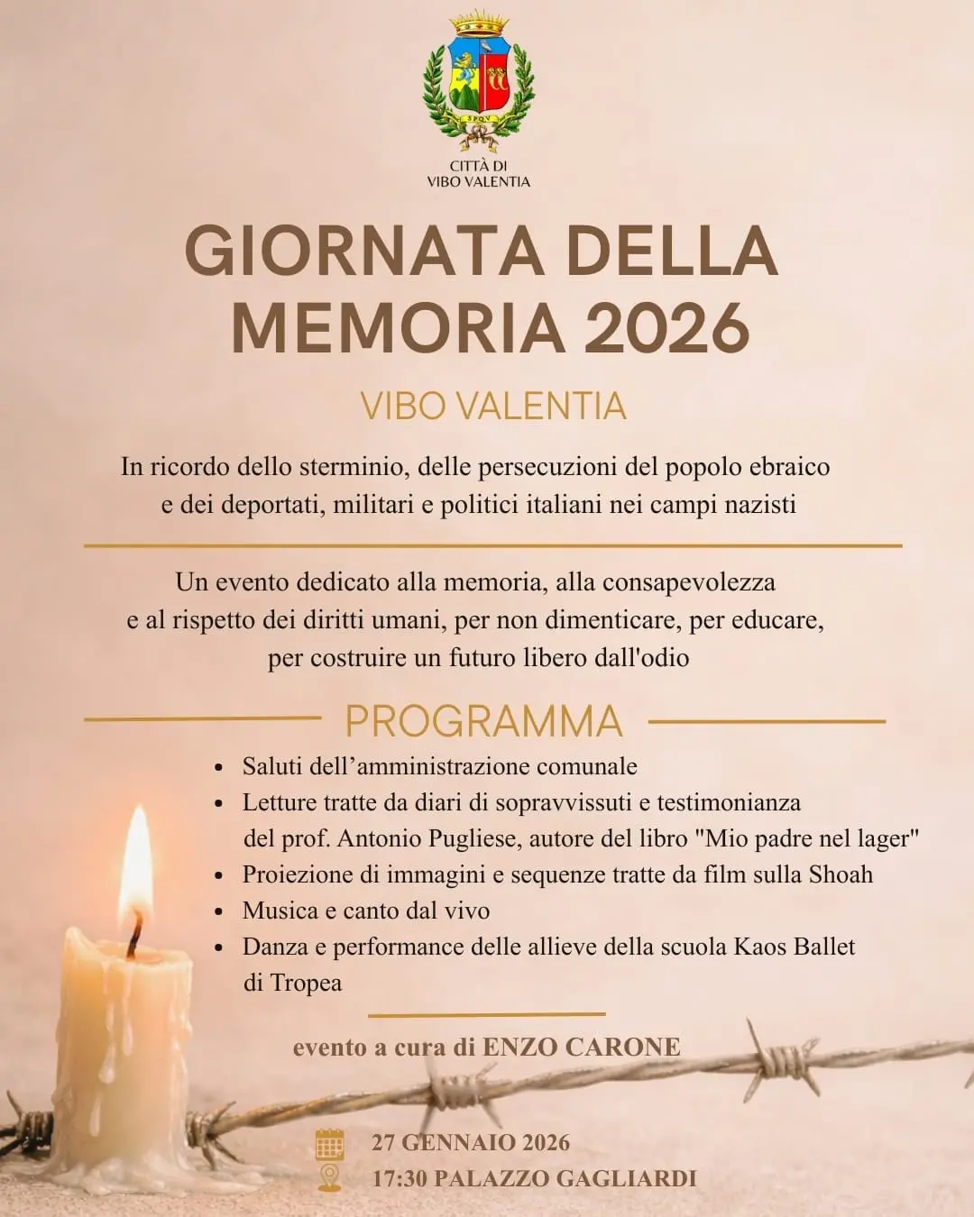 Il Comune di Vibo Valentia organizza, in occasione della Giornata della Memoria 2026, un evento commemorativo dedicato al ricordo dello sterminio e delle persecuzioni del popolo ebraico, nonché alla memoria dei deportati italiani, civili, militari e politici, nei campi di concentramento nazisti.
